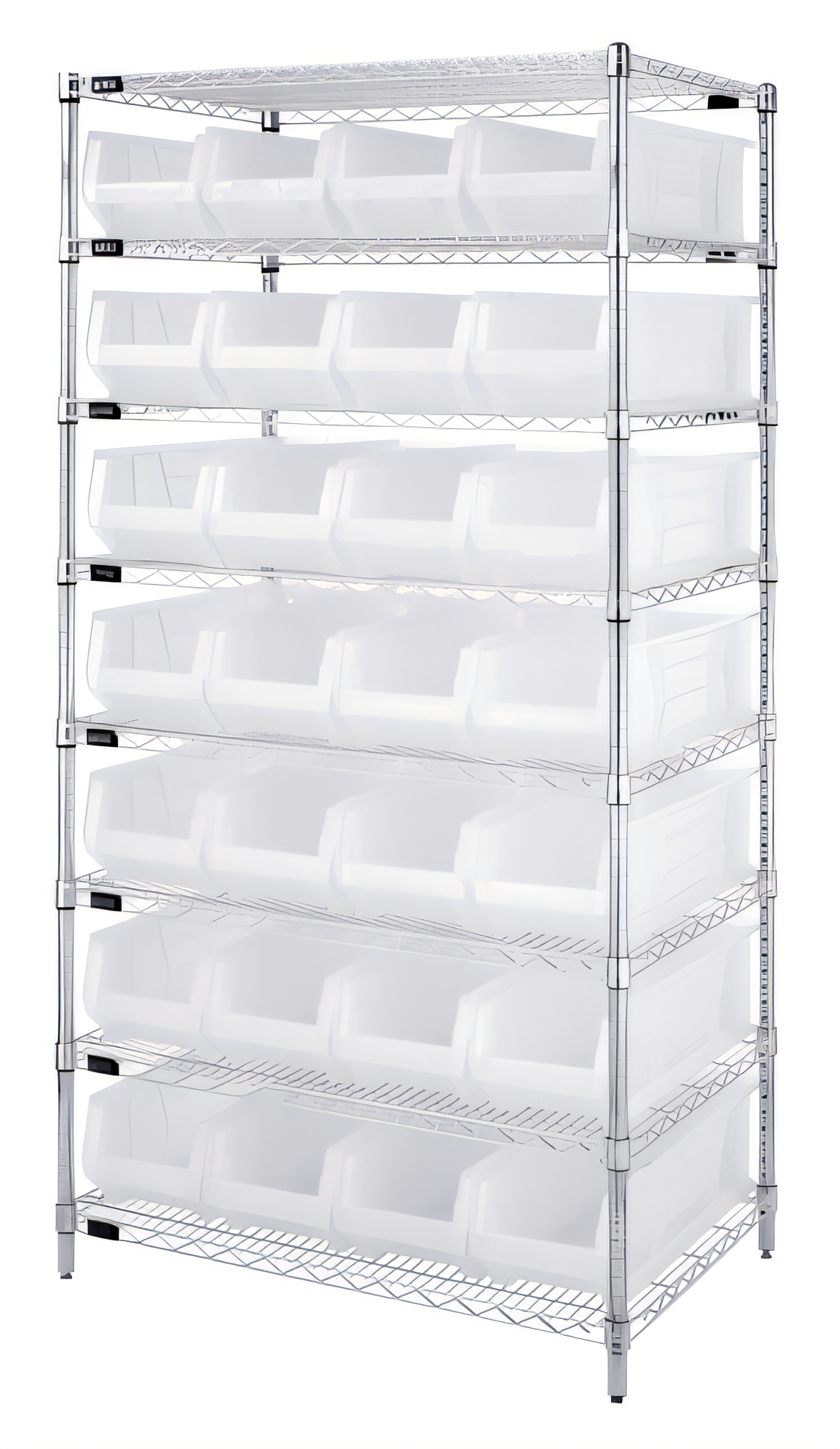 Includes 8 chrome wire shelves + 28 clear QUS950 binsOrganize parts, products and supplies in one easy-to-access footprint. Quantum’s complete wire shelving kit combines industrial-strength chrome shelving with crystal-clear polypropylene bins, giving you high-capacity storage that keeps contents visible, clean and close at hand.