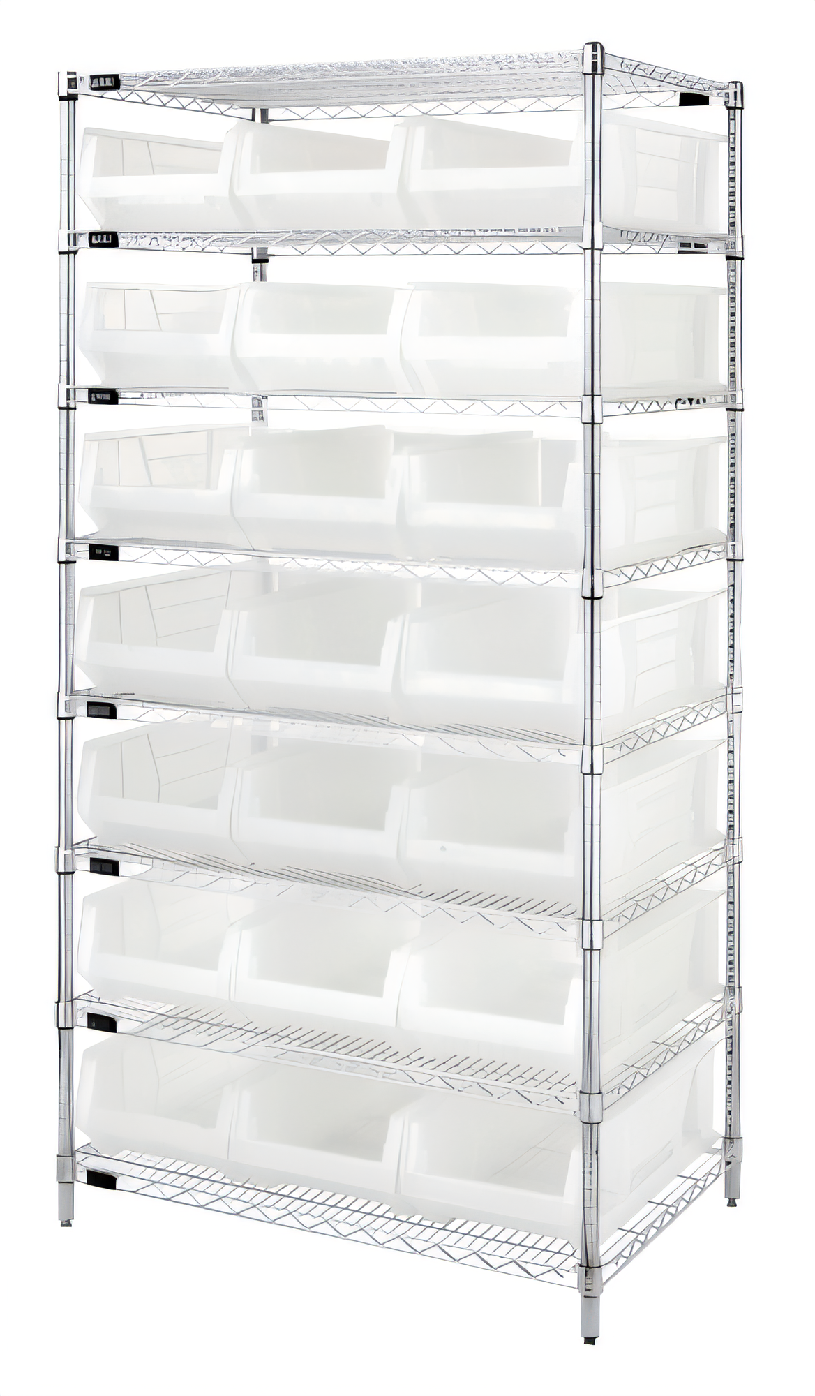 Chrome plated | 800 lb per shelf | Includes 21 QUS952 storage binsOrganize parts, inventory, or supplies in one high-capacity, easy-to-access location. Quantum’s bin wire shelving system combines heavy-duty chrome wire shelves with durable QUS952 polypropylene bins, giving you a turnkey storage solution that maximizes cubic space, improves product visibility, and keeps small- to medium-sized items neatly sorted.