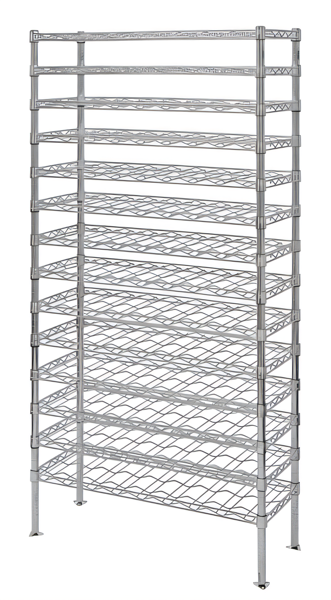 204-Bottle Capacity | Chrome Plated | 48" W × 14" D × 86" HTransform any cellar, retail floor or back-of-house storage area into a sleek, high-density wine display. Quantum’s wire Wine Cradle Shelving Unit keeps every label visible and every bottle easily accessible while safeguarding your collection with commercial-grade strength and stability.