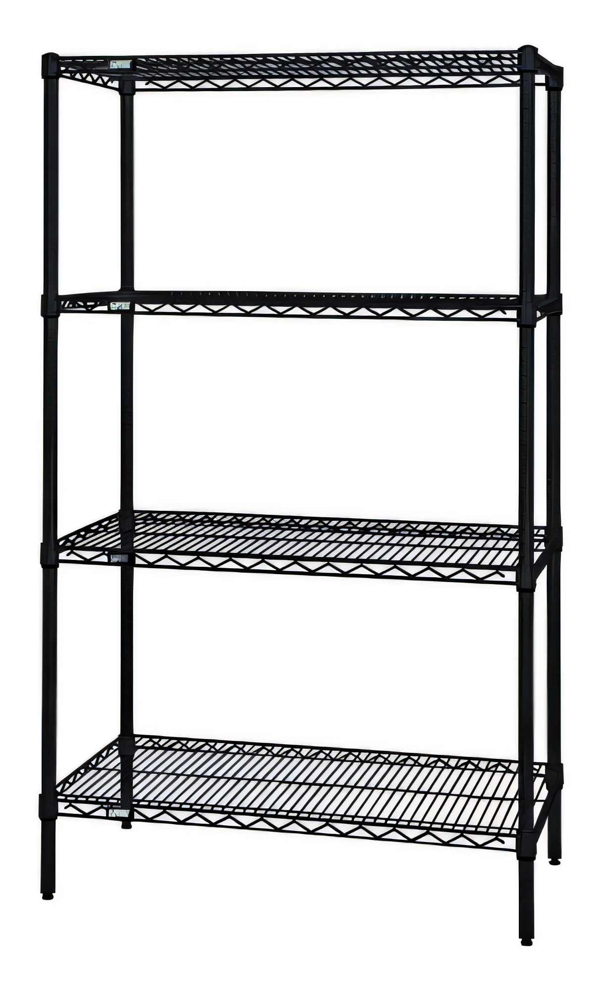 Wire Shelving Starter Kit, 48"W x 18"D x 86"H, 600 - 800 lb. capacity, includes (4) wire shelves & (4) posts, black epoxy antimicrobial finish, NSF, shipped KD
