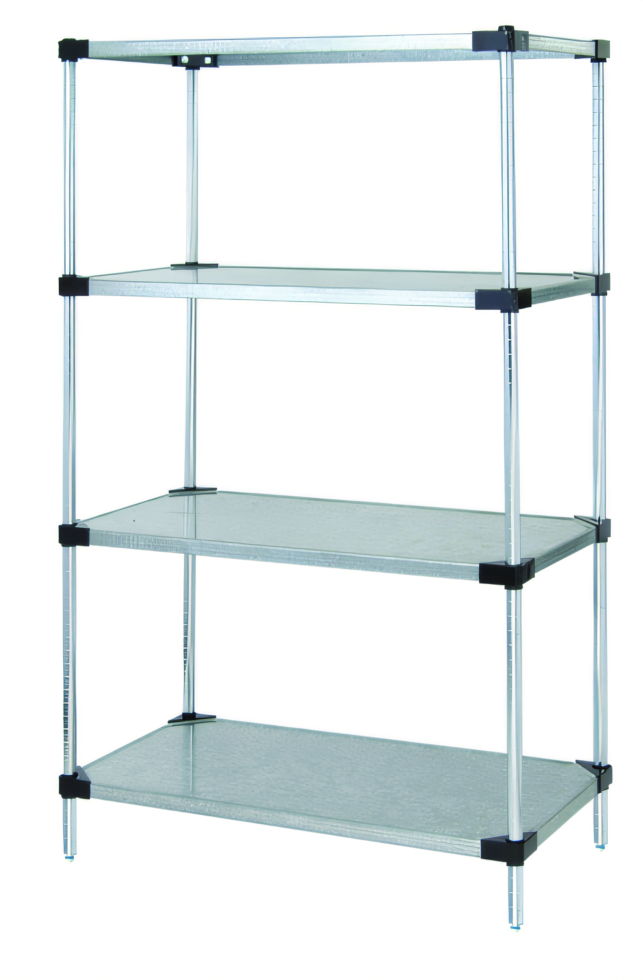 Solid Shelving Starter Kit, 60"W x 18"D x 86"H, includes (4) solid shelves and (4) posts, galvanized steel shelves and chrome posts finish, NSF, shipped KD