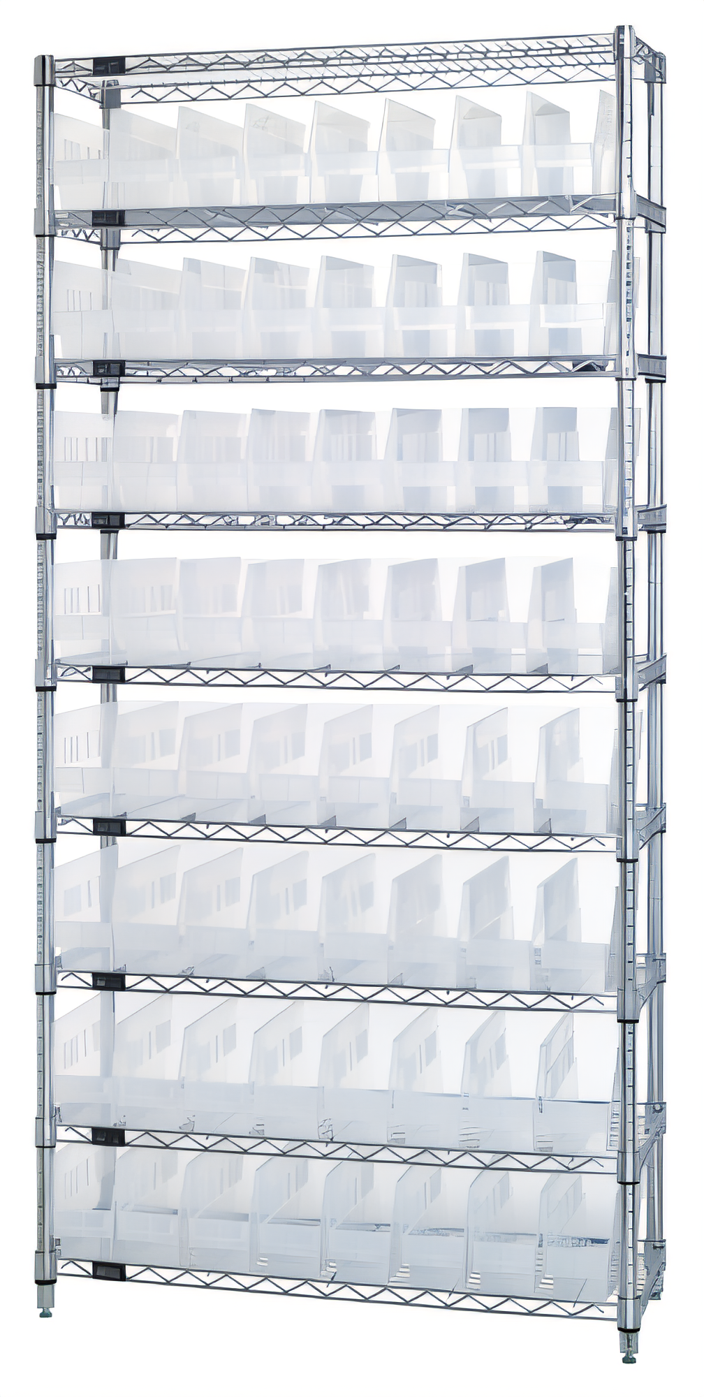 Bin Wire Shelving System, 36"W x 12"D x 74"H overall size, 800 lb. capacity per shelf, includes: (9) wire shelves, (4) posts, and (64) QSB201 clear bins, chrome plated finish