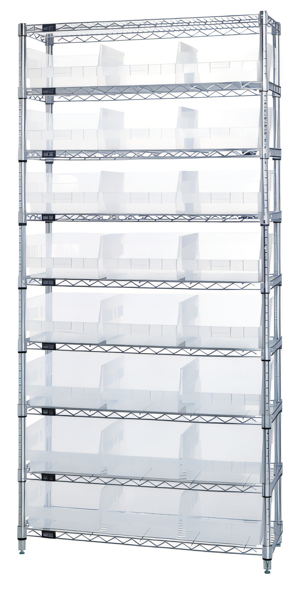 Bin Wire Shelving System, 36"W x 12"D x 74"H overall size, 800 lb. capacity per shelf, includes: (9) wire shelves, (4) posts, and (24) QSB209 clear bins, chrome plated finish