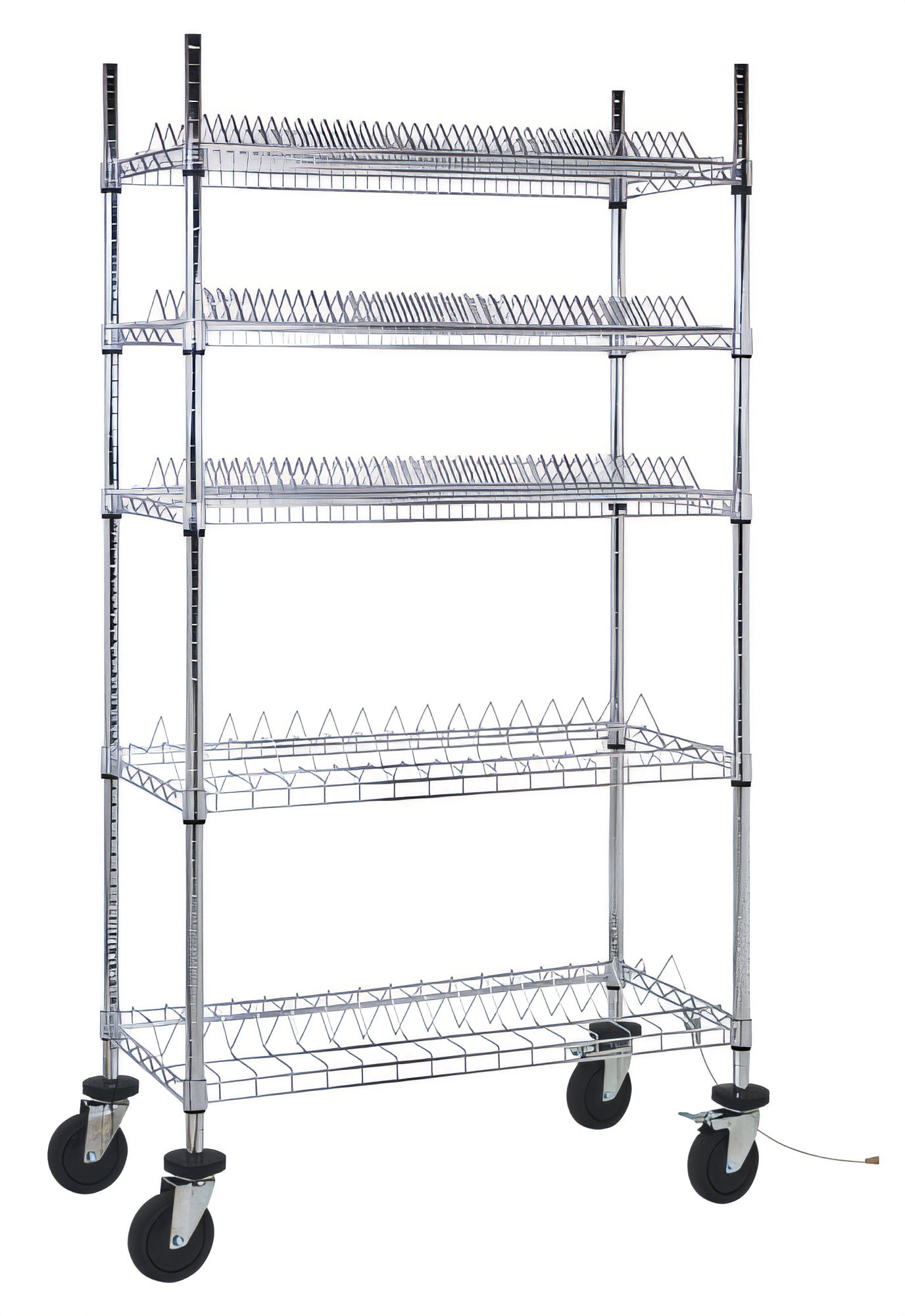 Reel Shelving Cart, 36"W x 18"D x 69"H, includes: (2) 15-reel & (3) 78-reel wire shelves, (4) conductive swivel casters (2 with brakes) & drag chain, chrome plated finish