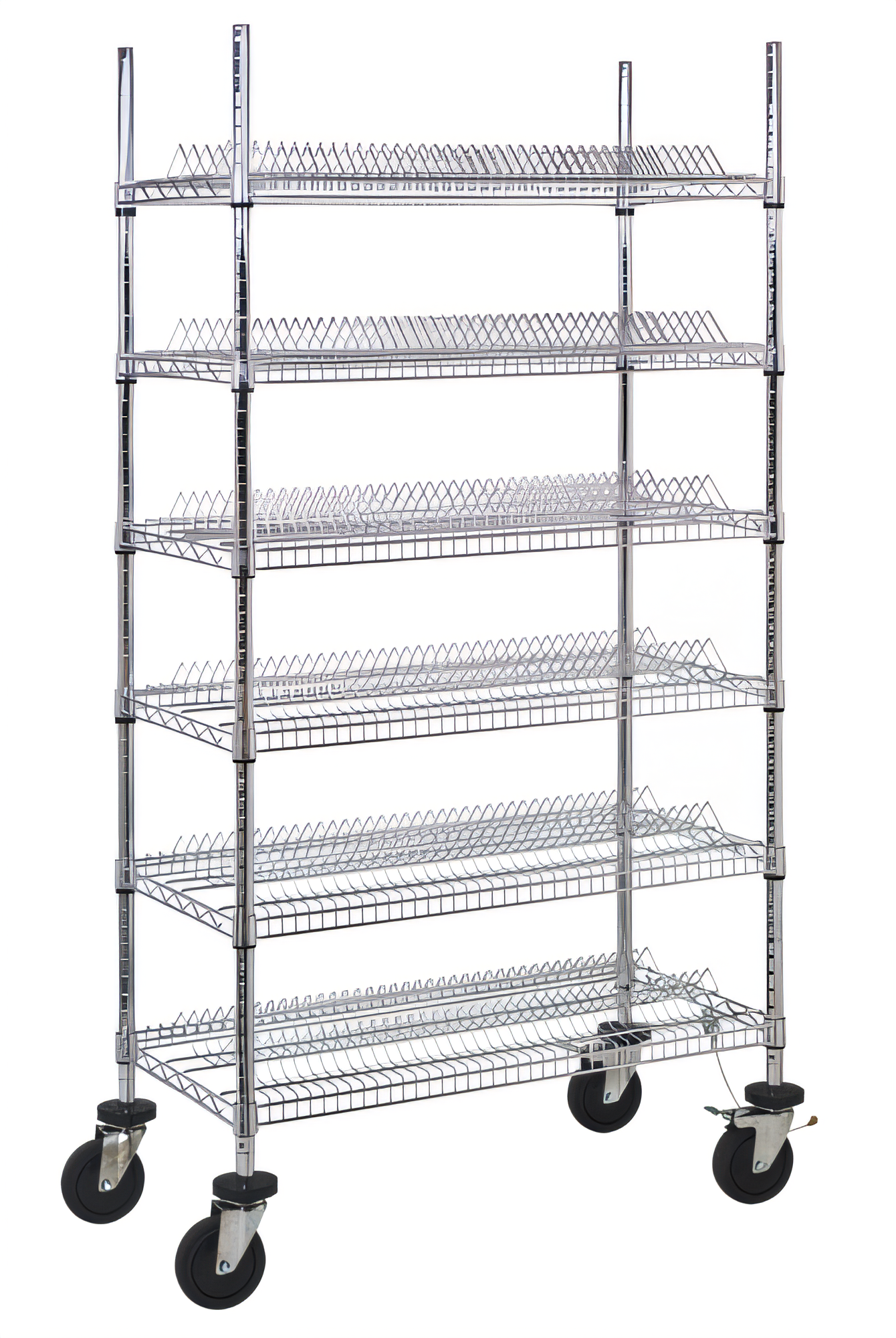 Reel Shelving Cart, 36"W x 18"D x 69"H, includes: (6) 78-reel wire shelves, (4) conductive swivel casters (2 with brakes) & drag chain, chrome plated finish