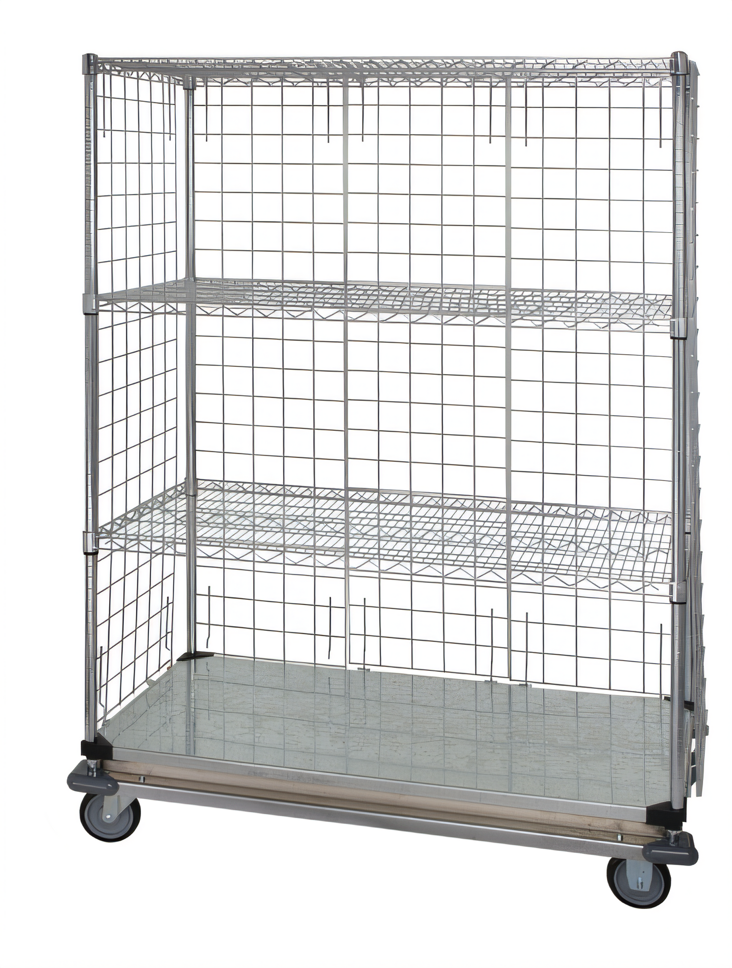 Heavy-duty, 1200 lb capacity storage cart with chrome finishBuilt for warehouses, laboratories, healthcare facilities, and back-of-house retail, the Quantum Wire Enclosed Cart keeps high-value or sensitive items secure while staying effortlessly mobile. Its chrome-plated wire construction promotes air circulation and visibility, while the solid galvanized shelf lets you transport loose or small items without the risk of fall-through. A rugged dolly base and industrial plate casters deliver smooth, stable movement—even at the full 1200 lb load rating.
