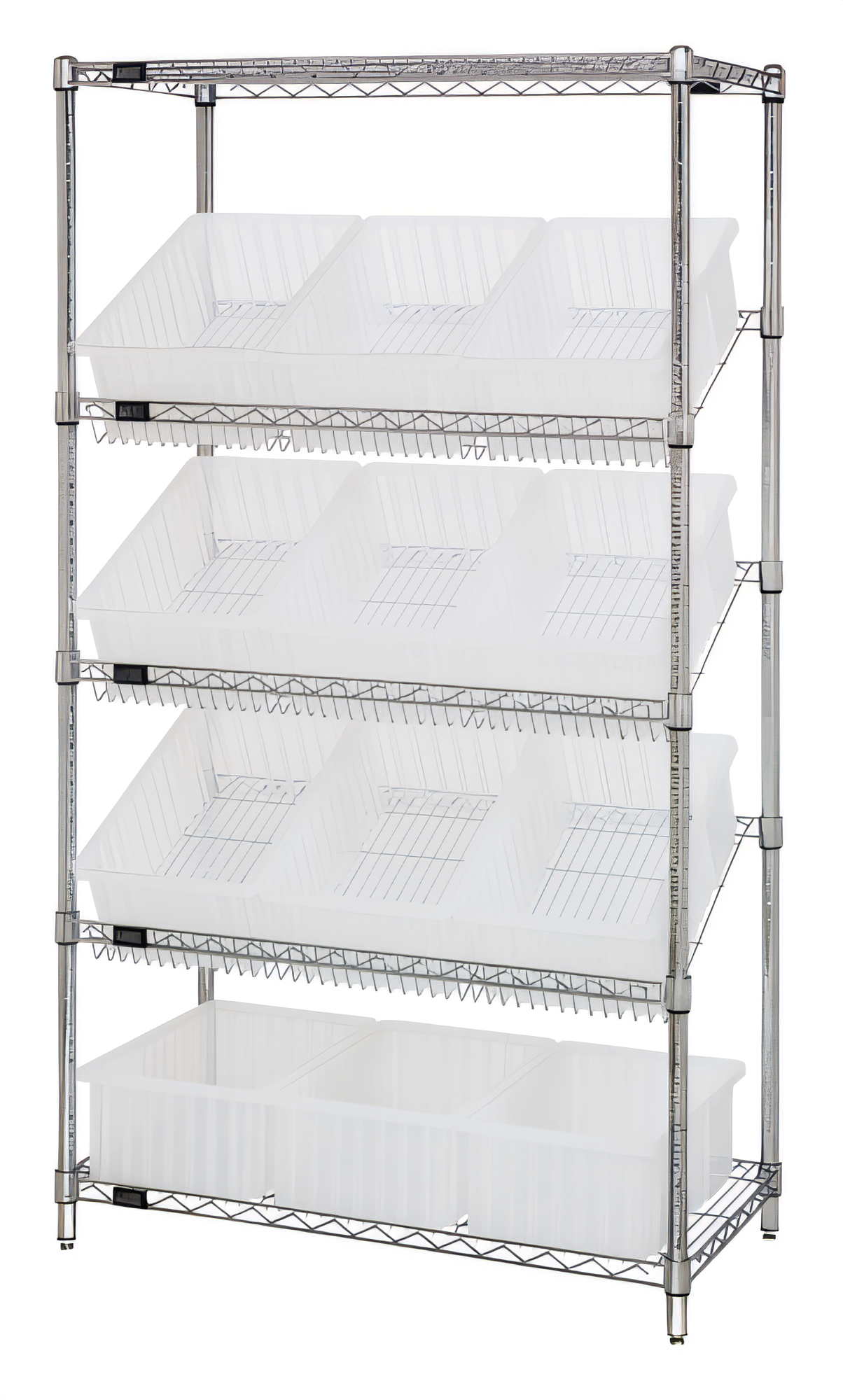 Bin Systems Unit, stationary, 36"W x 18"D x 63"H, includes: (2) flat wire shelves, (3) slanted wire shelves, (4) posts, & (12) 16-1/2"W x 10-7/8"D x 6"H clear bins (DG92060CL), chrome plated finish, NSF, shipped KD