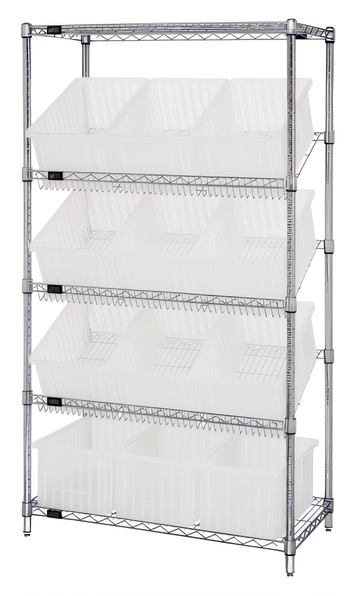 Bin Systems Unit, stationary, 36"W x 18"D x 63"H, includes: (2) flat wire shelves, (3) slanted wire shelves, (4) posts, & (12) 16-1/2"W x 10-7/8"D x 8"H clear bins (DG92080CL), chrome plated finish, NSF, shipped KD