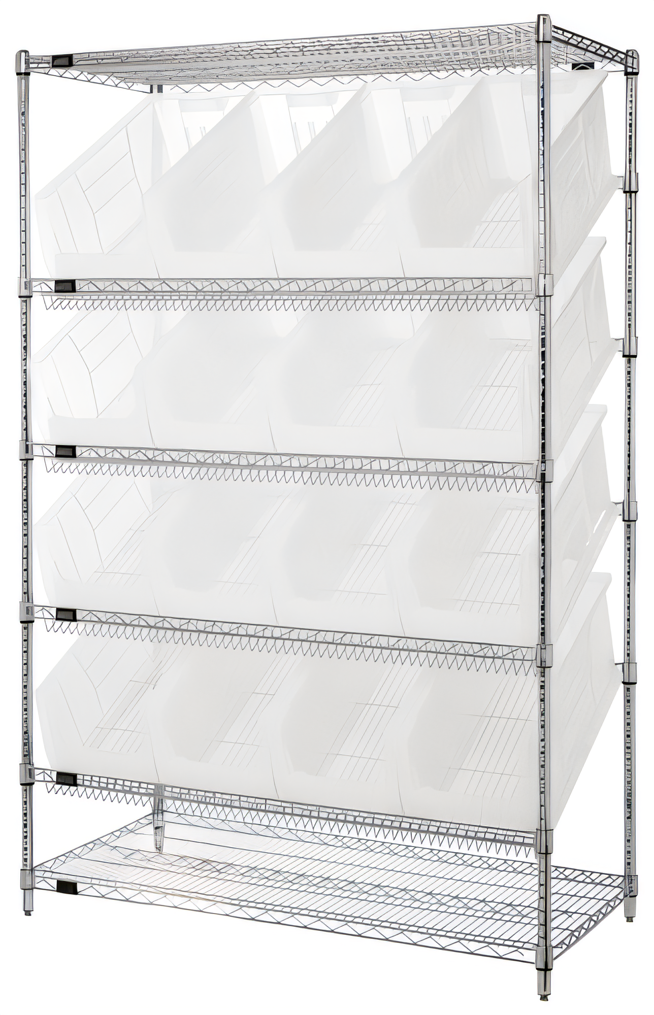 6 Chrome Shelves & 16 Clear QUS953 Bins IncludedOrganize parts, products or supplies in one robust, easy-to-pick solution. This Quantum bin system pairs heavy-duty chrome shelving with crystal-clear bins, giving you instant visibility, rock-solid capacity and an ergonomic mix of flat and slanted shelves.
