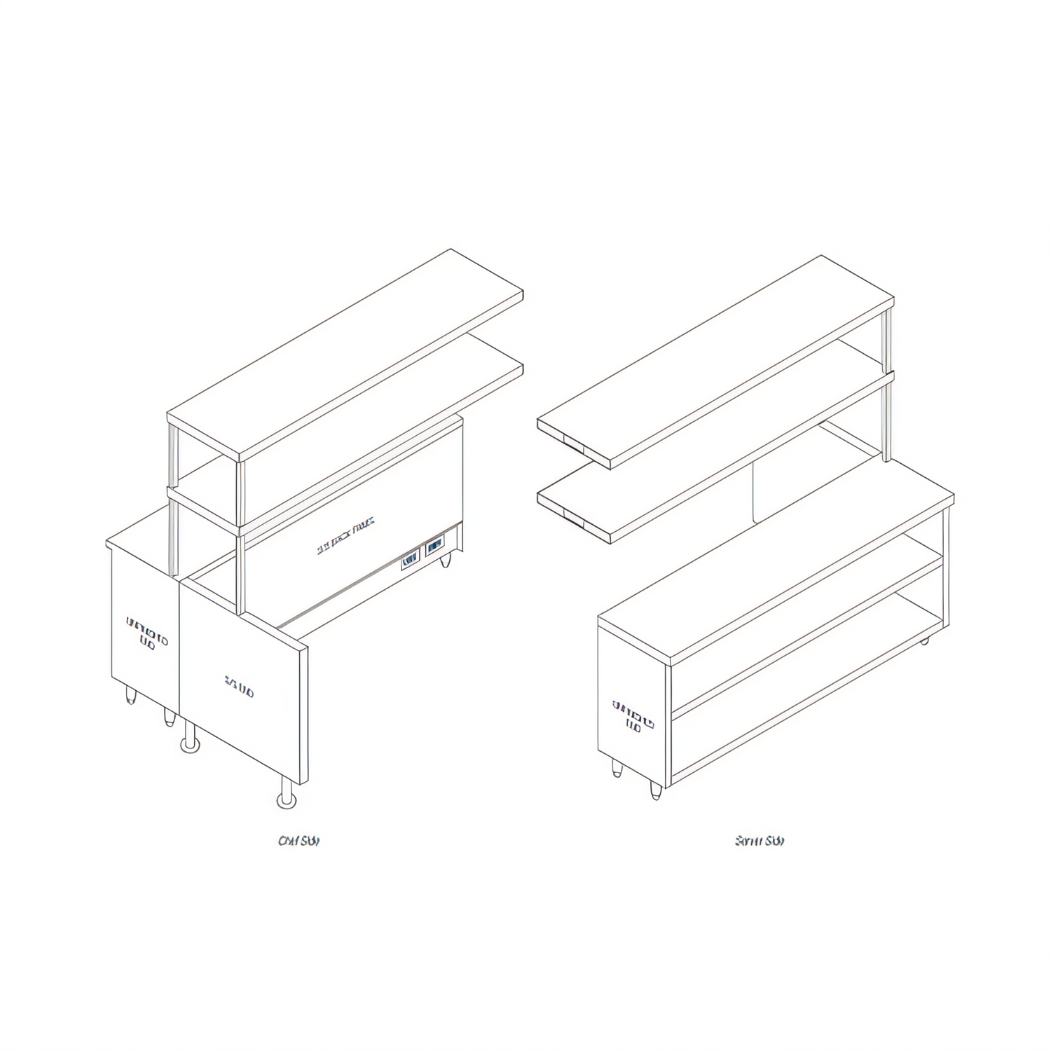 Plate-Storage Cabinet • Double Overshelf • Left Wing Wall • Pre-Wired PowerBuild a faster, cleaner and more organized cook line with Randell’s Modular Chef Service Counter system. This 74-1/2" center section drops seamlessly into a 3-piece island or peninsula, bringing rugged all-stainless construction, built-in plate storage and two tiers of overshelving right where the action is. Pre-wired 120 V and 208 V receptacles keep small appliances and warmers powered without extension cords, while the adjustable leg frame slides left or right to dodge floor drains or other obstructions.