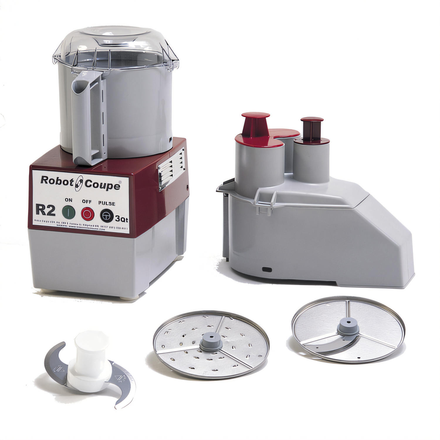 Commercial Food Processor, 3 liter gray polycarbonate bowl with handle, vegetable prep attachment with external ejection, kidney-shaped opening, includes: (1) "S" blade (27055), (1) 2mm grating disc (27577), (1) 4mm slicing disc (27566), continuous feed, bowl attachment designed for vertical cutting & mixing, on/off & pulse switch, single speed, 1725 RPM, 120v/60/1-ph, 7.0 amps, 1 HP, NEMA 5-15P, cETLus, ETL-Sanitation