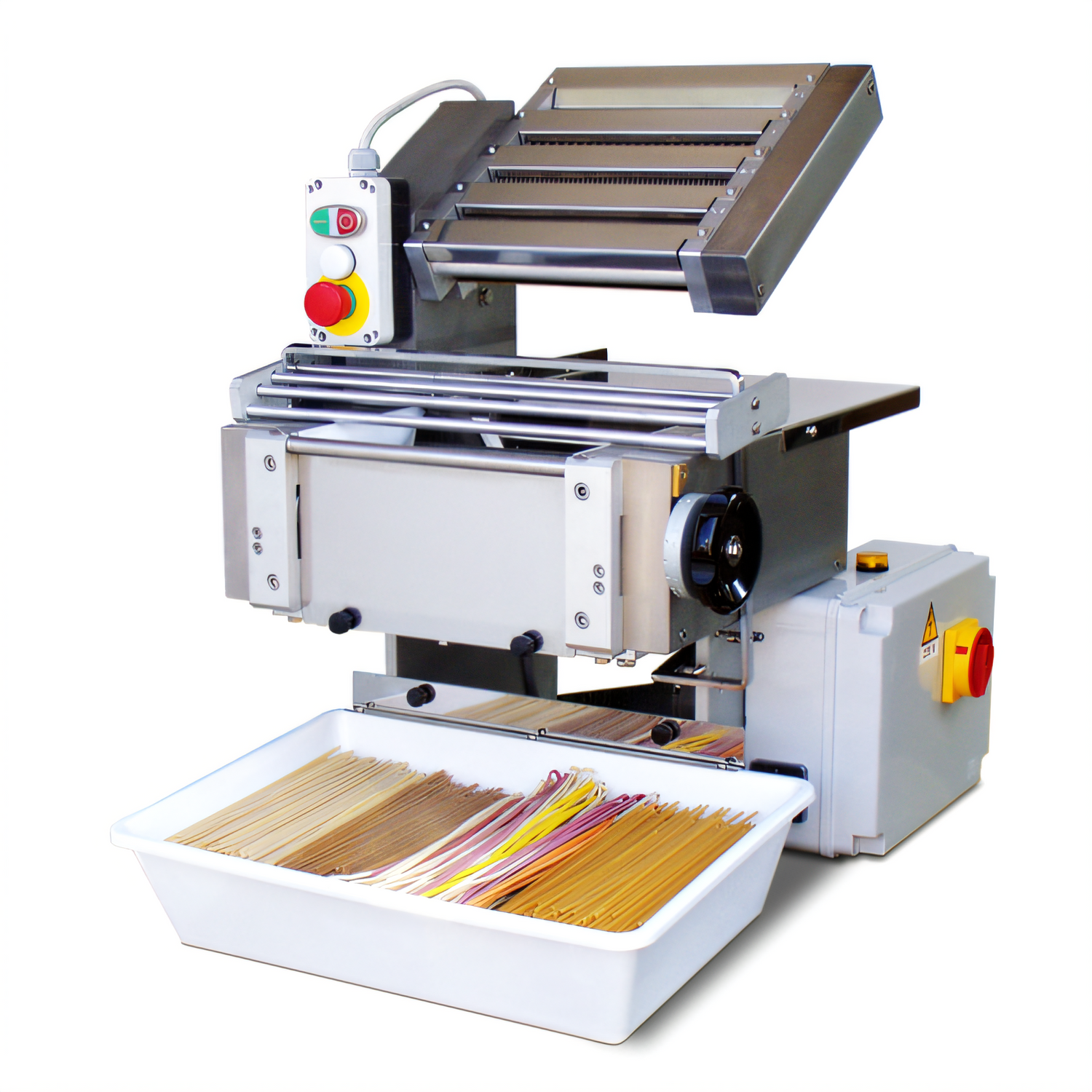 Rosito Bisani Capitani electric countertop pasta sheeter — 1HP stainless unit, adjustable thickness, heavy-duty, safety grill, makes multiple pasta types.