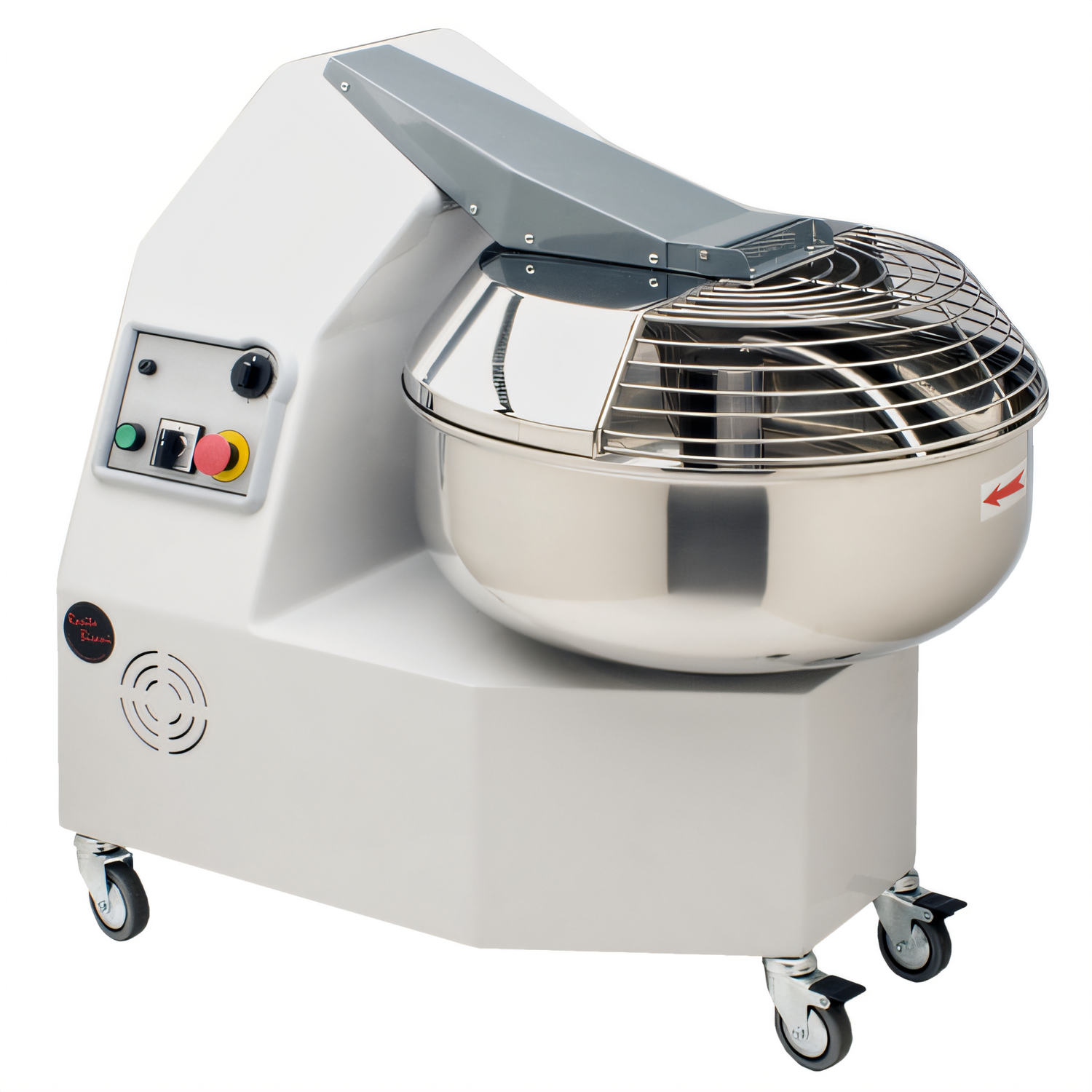 Mecnosud Fork Dough Mixer, 1-speed, 35.5 lbs. flour capacity, 31 quart volume capacity, stainless steel bowl, forked kneading with stainless steel spiral fork, rotating parts on ball bearings. stainless steel frame, braked casters, 220v/60/1-ph, ETLus, NSF