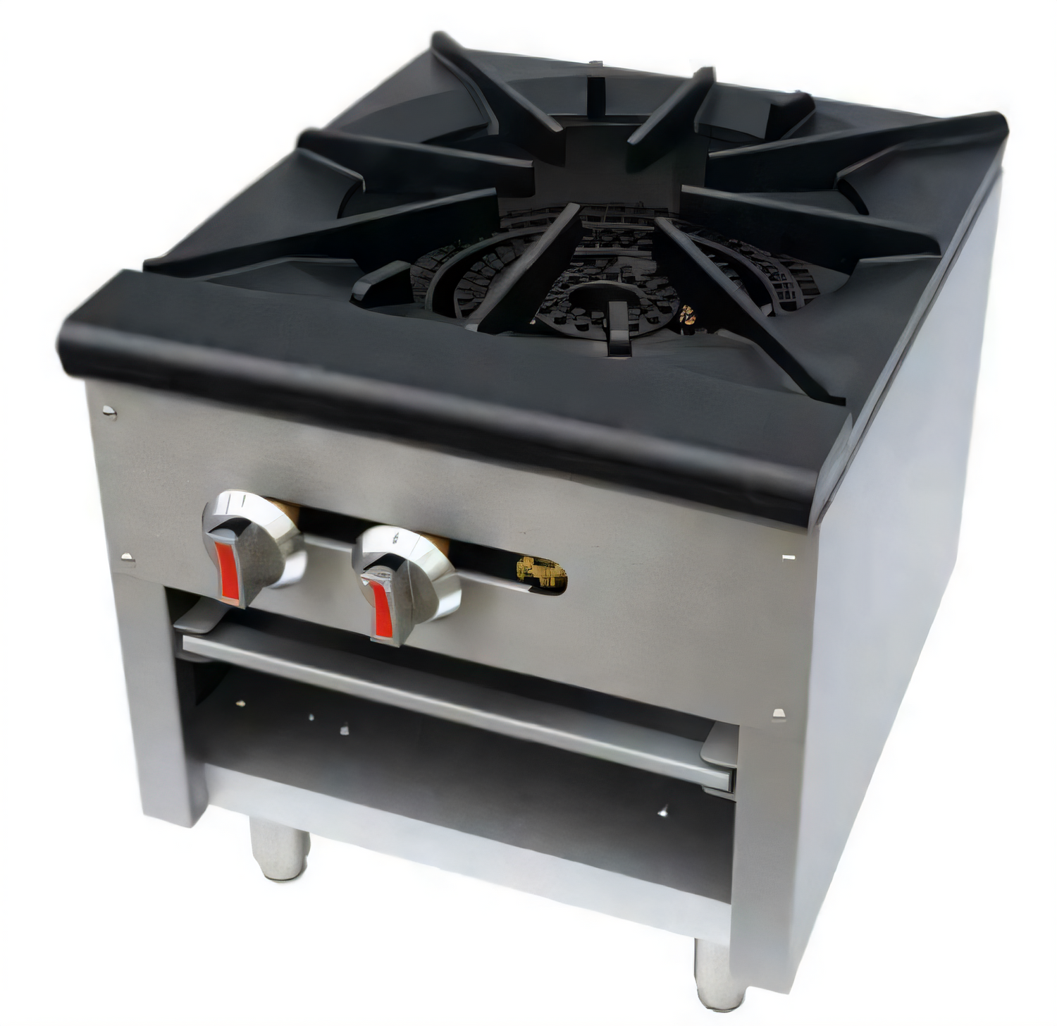 Sapphire 18" stock pot gas range 80,000 BTU with cast iron burner, stainless steel body, 1" adjustable legs, conversion kit included.