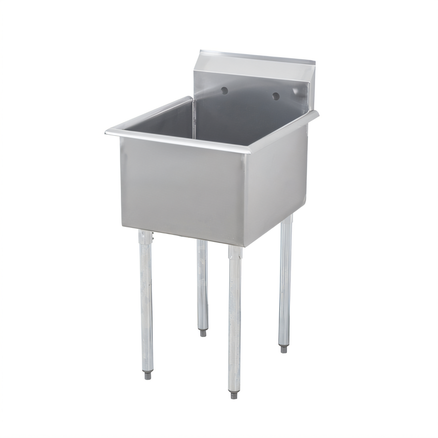 Budget Sink, one compartment, 21"W x 24-1/2"D, 18/430 stainless steel construction, 18" wide x 21" front-to-back x 13" deep bowl, 8" OC splash mount faucet holes, 1-1/2" rounded edge on working sides, 7-1/4" backsplash, 201 stainless steel tubing legs, 1" adjustable plastic bullet feet, KD, NOT NSF Certified