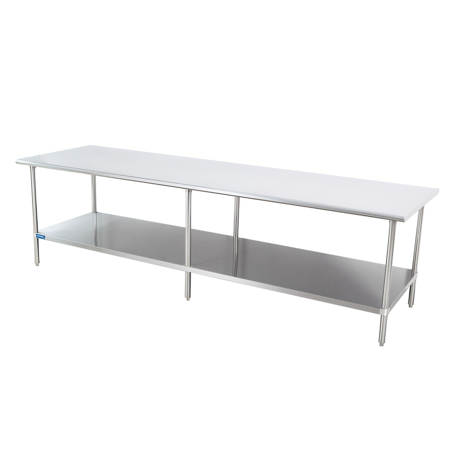 Work Table, 120"W x 30"D, 18/400 stainless steel reinforced top, 1-1/2" rounded edge on front & rear, flat edge on both ends, adjustable stainless steel undershelf, (6) stainless steel tubular legs, 1" adjustable stainless steel bullet feet, KD, NSF