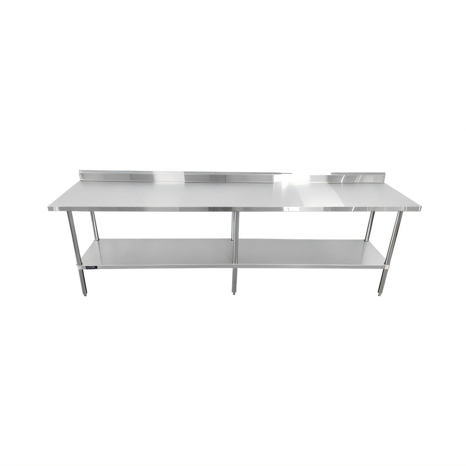 Worktable, 120"W x 30"D x 35"H, 18/430 stainless steel , beveled square edge, 5" backsplash, NSF