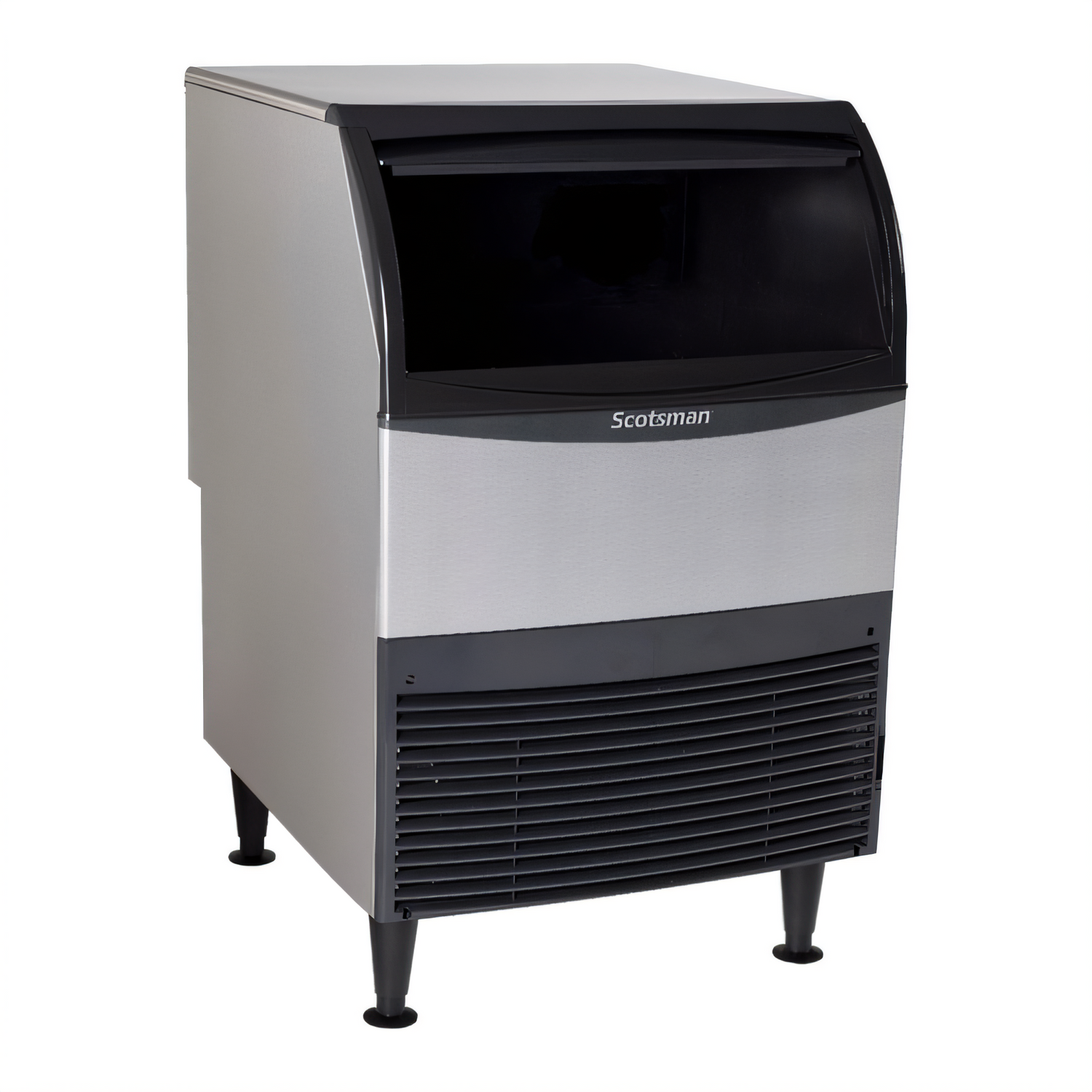 Scotsman UC2024SW-1 undercounter ice maker with built-in 80 lb bin delivers up to 230 lb of small cubes per day (188 lb AHRI certified). Water-cooled, self-contained condenser in a compact 24" width with recessed utility chase, QR-enabled diagnostics, included ice scoop and 6" adjustable legs. ENERGY STAR®, NSF and cULus certified, 115V with NEMA 5-15P plug — engineered and assembled in the USA for reliable commercial performance.