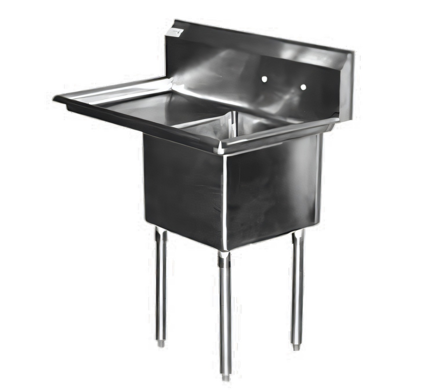 Heavy Duty Series Sink, one compartment, 39"W x 30"D x 45-1/2"H, 16/304 stainless steel, 18" wide x 24" front-to-back x 14" deep compartment, 18" drainboard on left, 10-1/2"H backsplash, 8" OC splash mount faucet holes, 3-1/2" basket strainer included, stainless steel gussets, galvanized legs with adjustable bullet feet, NSF