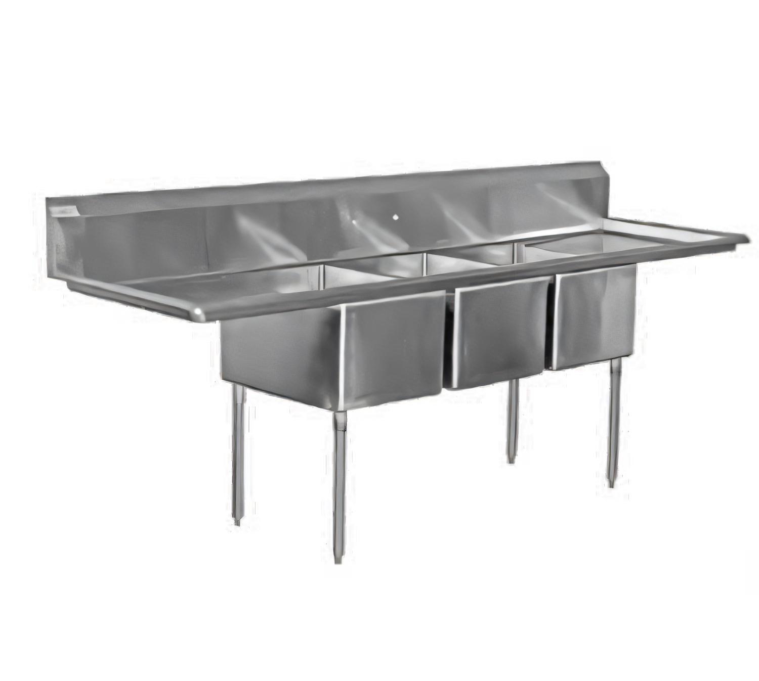 Heavy Duty Series Sink, three compartment, 106"W x 30"D x 45-1/2"H, 16/304 stainless steel, 18" wide x 24" front-to-back x 14" deep bowl deep compartments, 24" drainboards on left & right, 10-1/2"H backsplash, (1) set of 8" OC splash mount faucet holes, 3-1/2" basket strainers included, stainless steel gussets, galvanized legs with adjustable bullet feet, NSF
