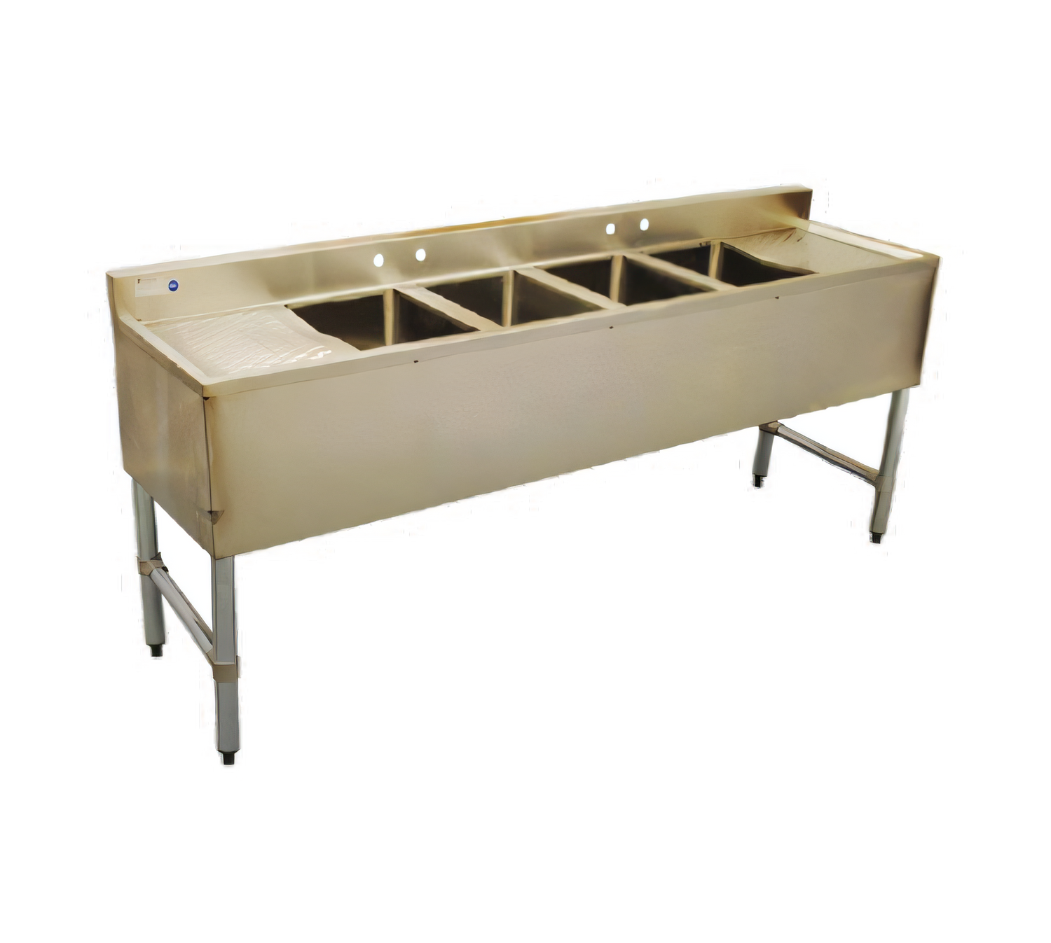 Underbar Sink, four compartment, 72"W x 18-3/4"D x 33"H, 18/304 stainless steel, 10" wide x 14" front-to-back x 10" deep compartments, 13" drainboards on left & right, 3"H backsplash, (2) sets of 4" OC splash mount faucet holes, 20/304 stainless steel apron on front & sides, 1-1/2" drains, galvanized steel legs & side crossbracing with adjustable bullet feet, NSF