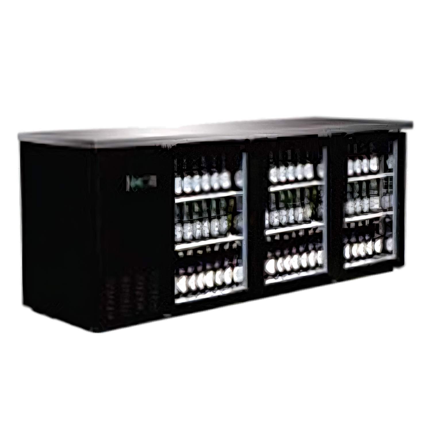 Back Bar Cooler, three-section, 73-1/10"W x 24-2/5"D x 36-1/5"H, 17.2 cu. ft. capacity, (3) glass doors, stainless steel top, electronic thermostat with LED display, temperature range 33°F - 41°F, white powder coated interior with stainless steel floor, black powder coated exterior, side mounted self-contained refrigeration, (6) 3.5" low profile casters(not installed), UL EPH Classified, cULus Classified, CE, ETL-Sanitation