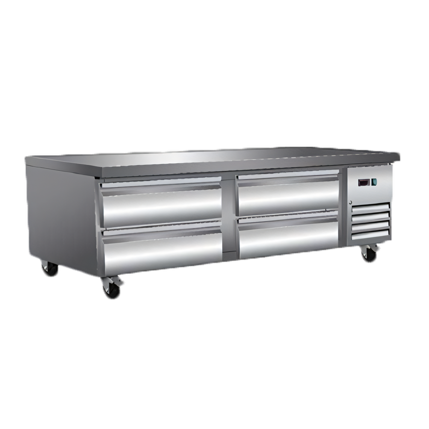 Chef Base, 74"W x 31-9/10"D x 26"H, (4) drawer, electronic thermostat, temperature range 33 - 41°F, LED digital display, auto defrosting & evaporation, stainless steel exterior, side mounted self-contained refrigeration, (4) casters (2 braked), cULus Classified, UL EPH Classified, CE