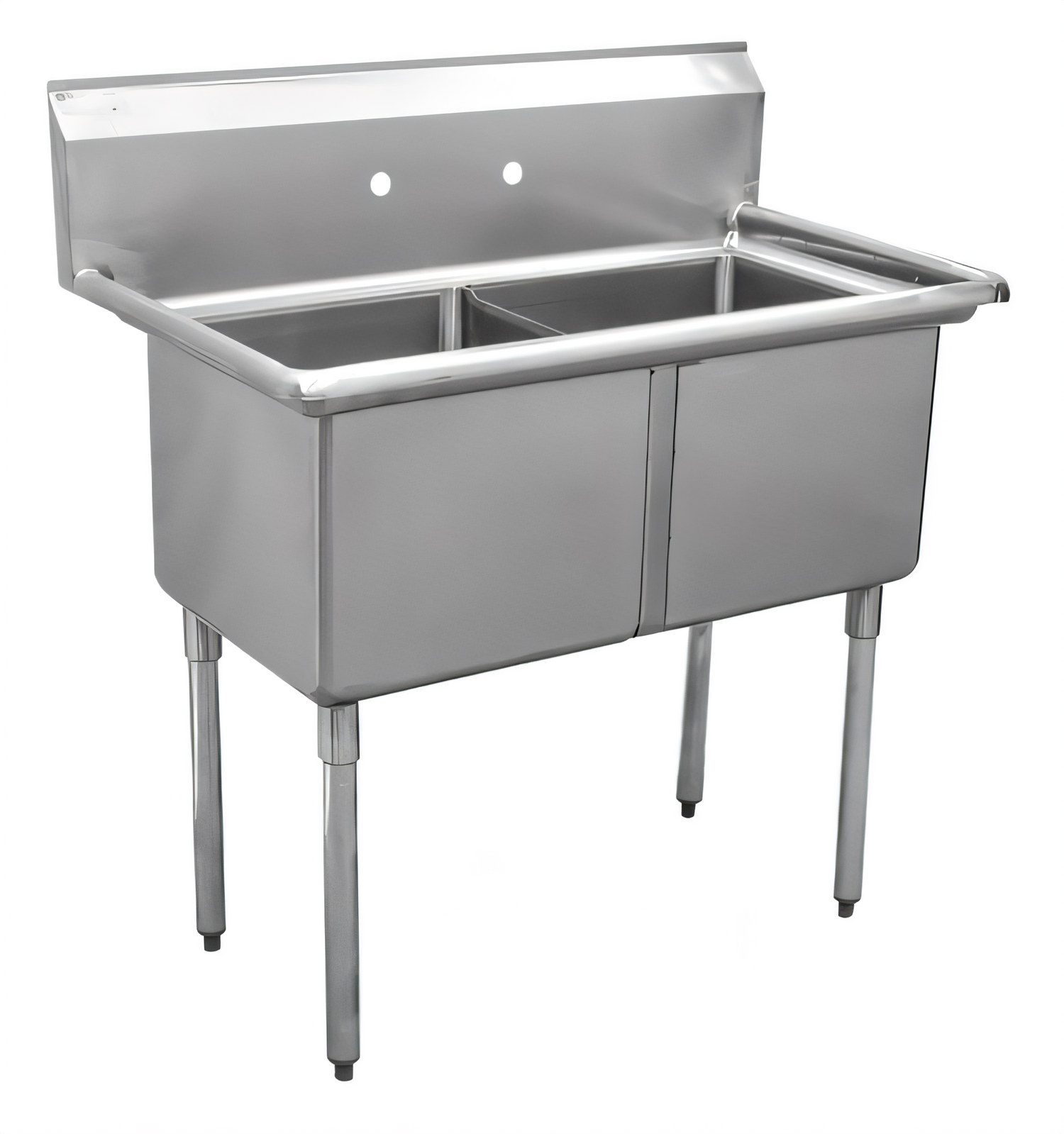 Economy Series Sink, two compartment, 37"W x 25-1/2"D x 45-1/2"H, 18/304 stainless steel, (2) 16" wide x 20" front-to-back x 12" deep compartments, 11-3/4"H backsplash, 8" OC splash mount faucet holes, raised rolled edges on front & sides, 3-1/2" basket drains with 1-1/2" outlets, stainless steel gussets, galvanized legs with adjustable plastic bullet feet, NSF