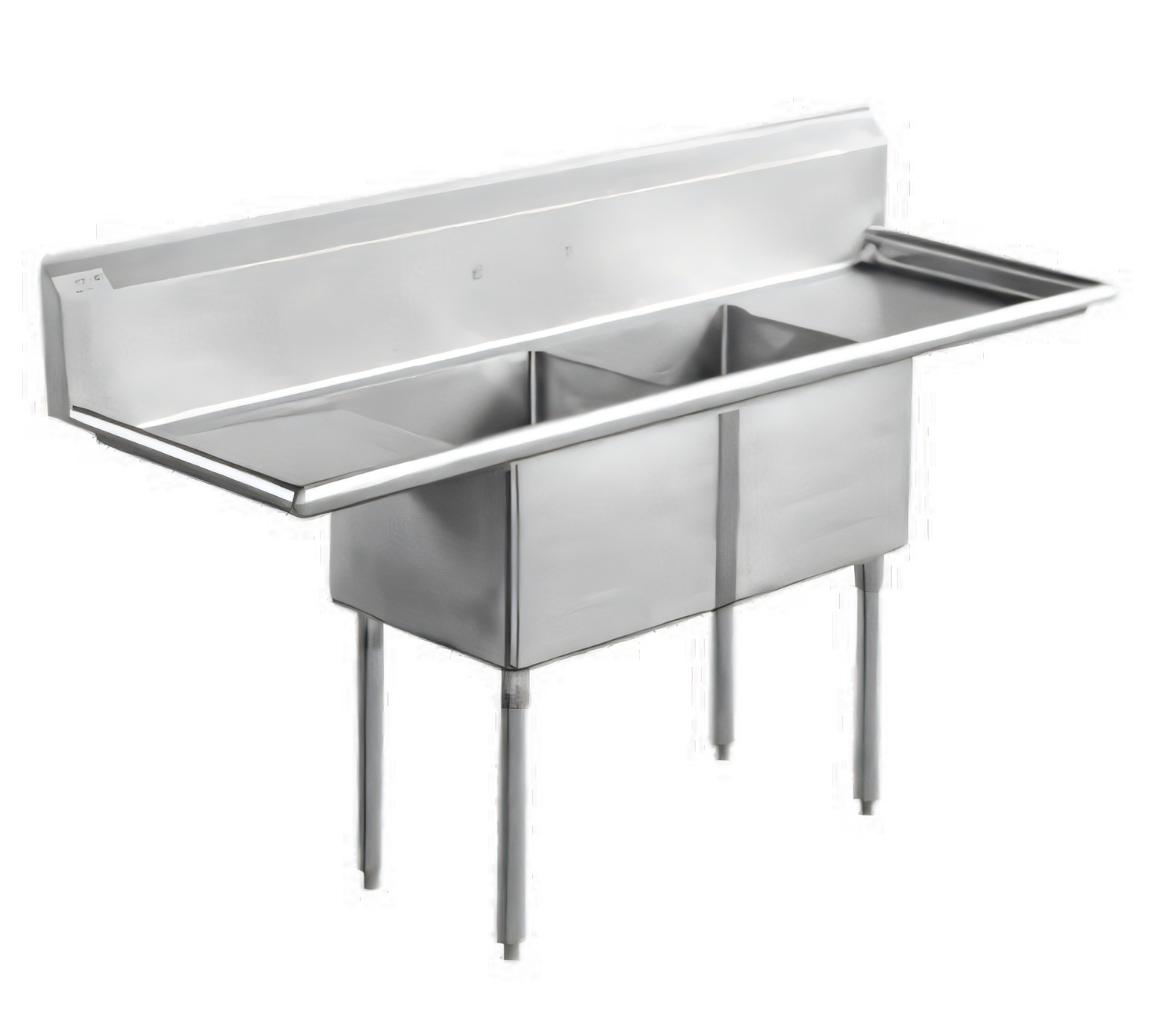 Economy Series Sink, two compartment, 72"W x 23-1/2"D x 45-1/2"H, 18/304 stainless steel, 18" wide x 18" front-to-back x 12" deep compartments, 18" drainboards on left & right, 11-3/4"H backsplash, 8" OC splash mount faucet holes, raised rolled edges on front & sides, 3-1/2" basket drains with 1-1/2" outlets, galvanized legs with adjustable plastic bullet feet, NSF
