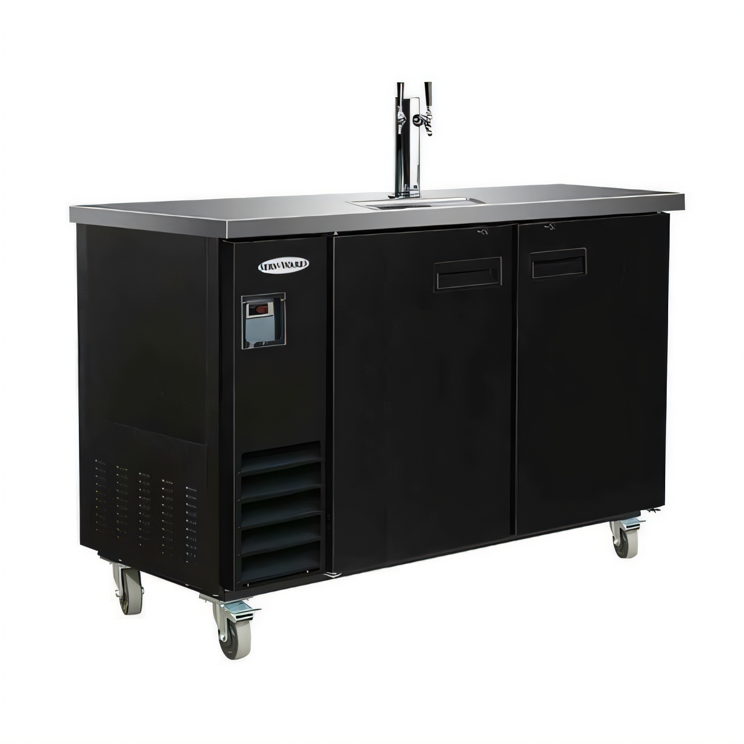 Draft Beer Dispenser, 49"W, 10.45 cu. ft. capacity, side mounted self-contained refrigeration, (1) stainless steel draft beer tower with (2) faucets, various keg capacities, (2) self-closing doors (locking), adjustable wire shelves, electronic thermostat, digital LED display, 33° to 41°F temperature range, automatic defrost, stainless steel top, stainless steel interior walls & ceiling, 430 stainless steel floor, black vinyl exterior, casters, R290 Hydrocarbon refrigerant, 2/5 HP, 115v/60/1-ph, 3.0 amps, cord, NEMA 5-15P, cETLus, ETL-Sanitation