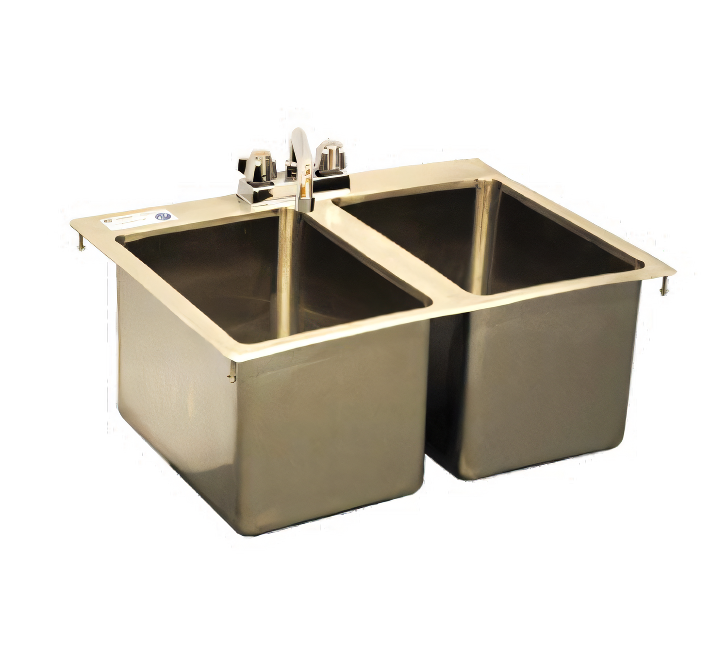 Drop-In Sink, two compartment, 24"W x 18"D, 16/304 stainless steel top, (2) 10" wide x 14" front-to-back x 10" deep 18/304 stainless steel bowls, 4" OC deck mounted faucet & 3-1/2" basket drain included, NSF