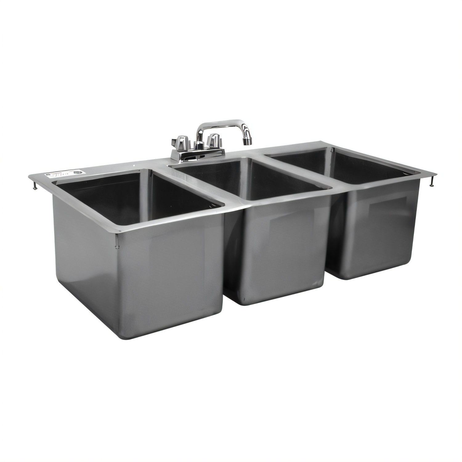 Drop-In Sink, three compartment, 55"W, 16/304 stainless steel top, (3) 16" wide x 20" front-to-back x 10" deep 18/304 stainless steel bowls, 4" OC deck mounted faucet & 3-1/2" basket drain included, NSF