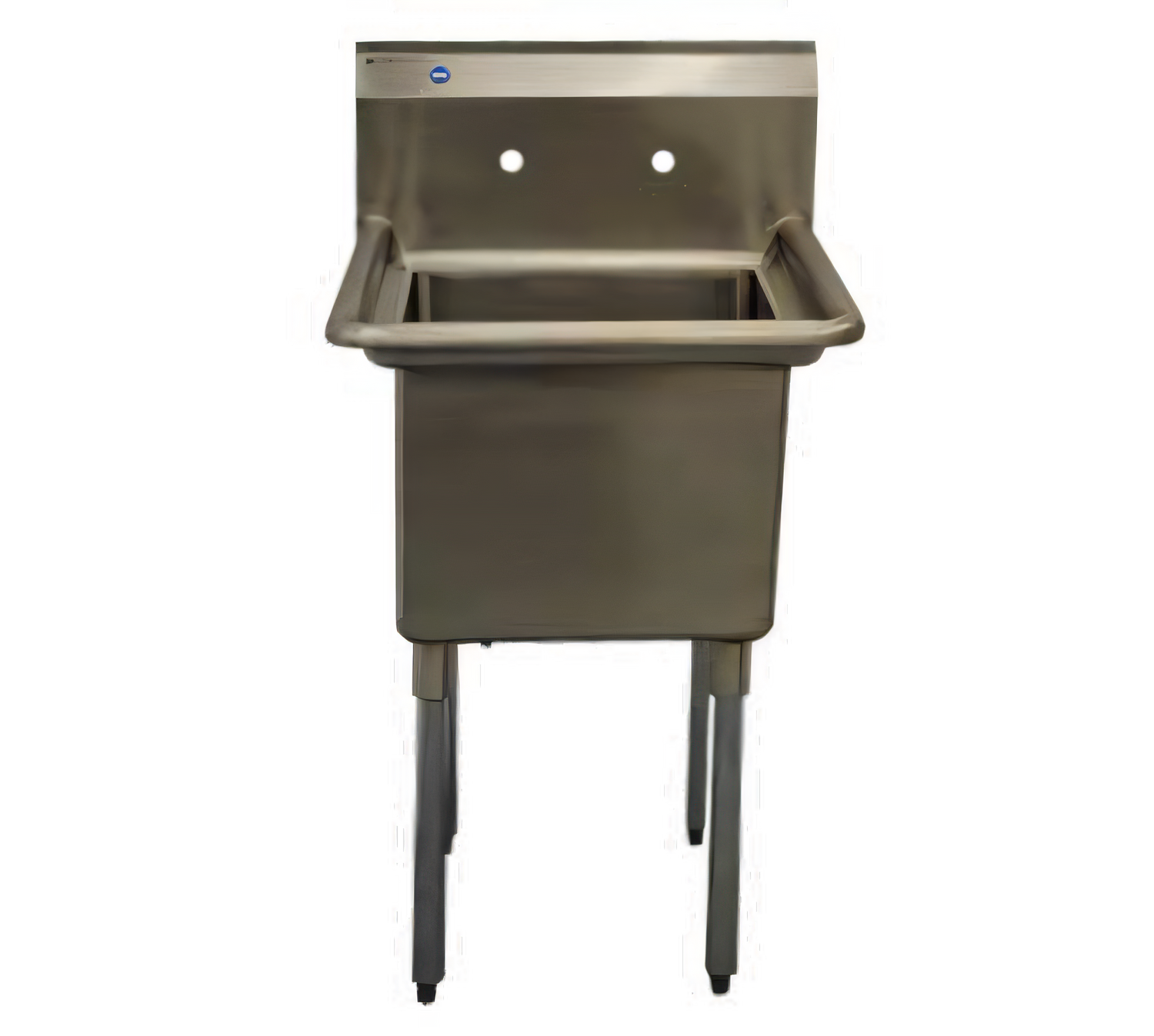 Serv-Ware - Sinks - 14" Deep Economy 1 Bowl - 23"W x 23.5"D x 45.5"H, 18/304 stainless steel, 18" wide x 18" front-to-back x 14" deep compartment, 11-3/4"H backsplash, 8" OC splash mount faucet holes, raised rolled edges on front & sides, 3-1/2" basket drains with 1-1/2" outlets, stainless steel gussets, galvanized steel legs with adjustable bullet feet, NSF