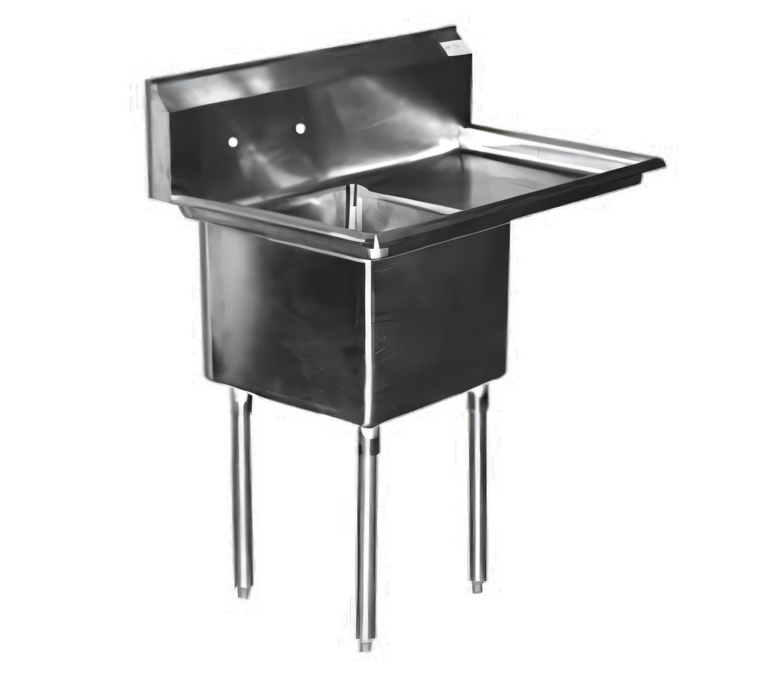 Economy Series Sink, one compartment, 44-1/2"W x 29-1/2"D x 45-1/2"H, 18/304 stainless steel, 18" wide x 24" front-to-back x 14" deep compartment, 24" drainboard on right, 11-3/4"H backsplash, 8" OC splash mount faucet holes, raised rolled edges on front & sides, 3-1/2" basket drains with 1-1/2" outlets, stainless steel gussets, galvanized steel legs with adjustable bullet feet, NSF