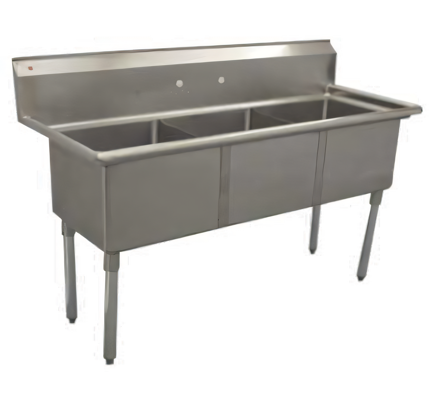Economy Series Sink, three compartment, 50"W x 20-1/2"D x 45-1/2"H, 18/304 stainless steel, 15" wide x 15" front-to-back x 14" deep compartments, 11-3/4"H backsplash, 8" OC splash mount faucet holes, raised rolled edges on front & sides, 3-1/2" basket drains with 1-1/2" outlets, stainless steel gussets, galvanized steel legs with adjustable bullet feet, NSF
