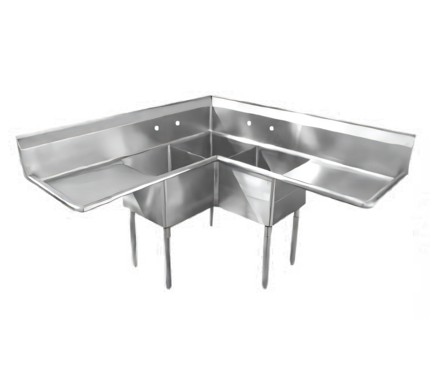 Economy Series Corner Sink, three compartment, 57"W, 18/304 stainless steel, 18" wide x 18" front-to-back x 14" deep compartments, 18" drainboards on left & right, 11-3/4"H backsplash, (2) sets of 8" OC splash mount faucet holes, raised rolled edges on front & sides, 3-1/2" basket drains with 1-1/2" outlets, 3-/12" basket drains included, stainless steel gussets, galvanized steel legs with adjustable bullet feet, NSF