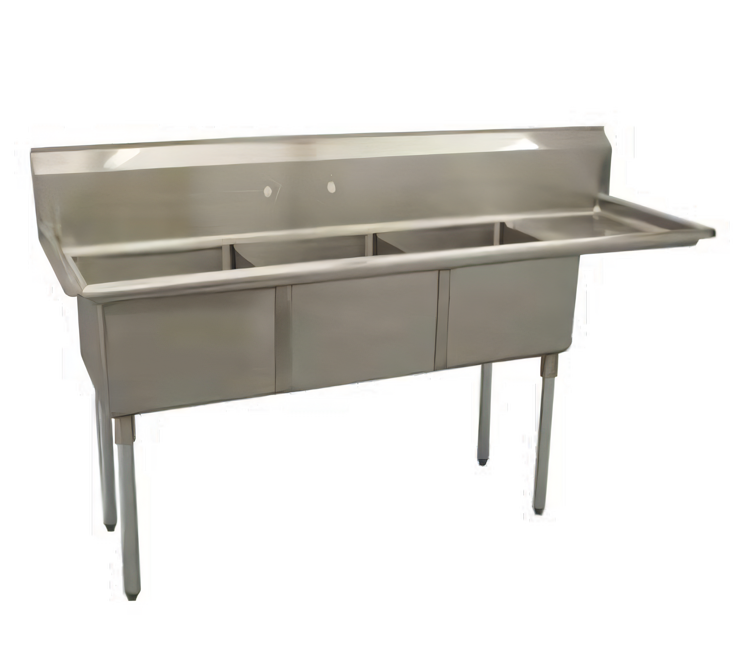 Economy Series Sink, three compartment, 80-1/2"W x 29-1/2"D x 45-1/2"H, 18/304 stainless steel, 18" wide x 24" front-to-back x 14" deep compartments, 24" drainboard on right, 11-3/4"H backsplash, 8" OC splash mount faucet holes, raised rolled edges on front & sides, 3-1/2" basket drains with 1-1/2" outlets, stainless steel gussets, galvanized steel legs with adjustable bullet feet, NSF