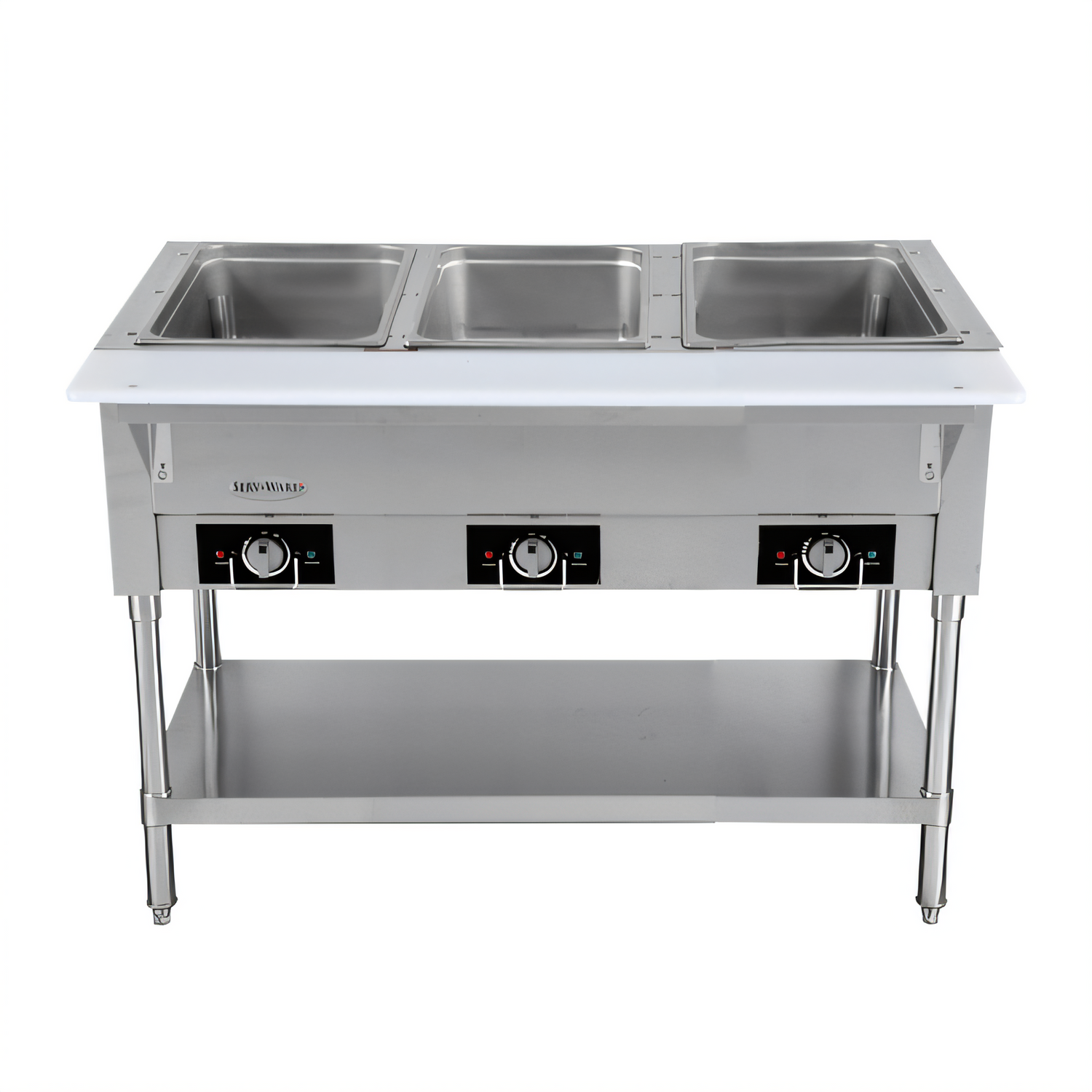 Hot Food Table, electric, 44"W x 29-1/2"D x 33-1/2"H, (3) open wells (accommodates standard size pans), individual infinite controls, stainless steel heating elements, removable cutting board, stainless steel open base with undershelf, adjustable stainless steel feet, 1500 watts, 115v, ETL-Sanitation