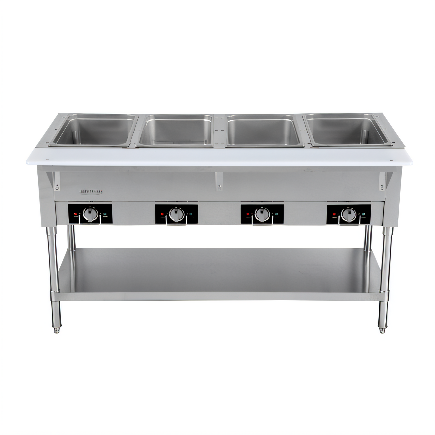 Hot Food Table, electric, 58-1/5"W x 29-1/2"D x 33-1/2"H, (4) open wells (accommodates standard size pans), individual infinite controls, stainless steel heating elements, removable cutting board, stainless steel open base with undershelf, adjustable stainless steel feet, 2000 watts, 115v, ETL-Sanitation