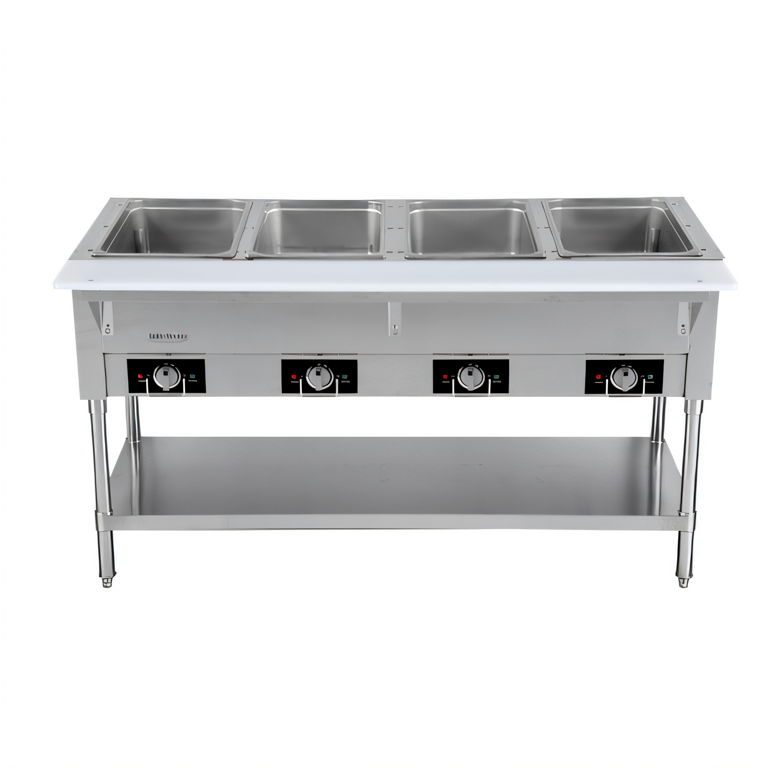 Hot Food Table, electric, 58-1/5"W x 29-1/2"D x 33-1/2"H, (4) open wells (accommodates standard size pans), individual infinite controls, stainless steel heating elements, removable cutting board, stainless steel open base with undershelf, adjustable stainless steel feet, 3000 watts, 220-240v, ETL-Sanitation