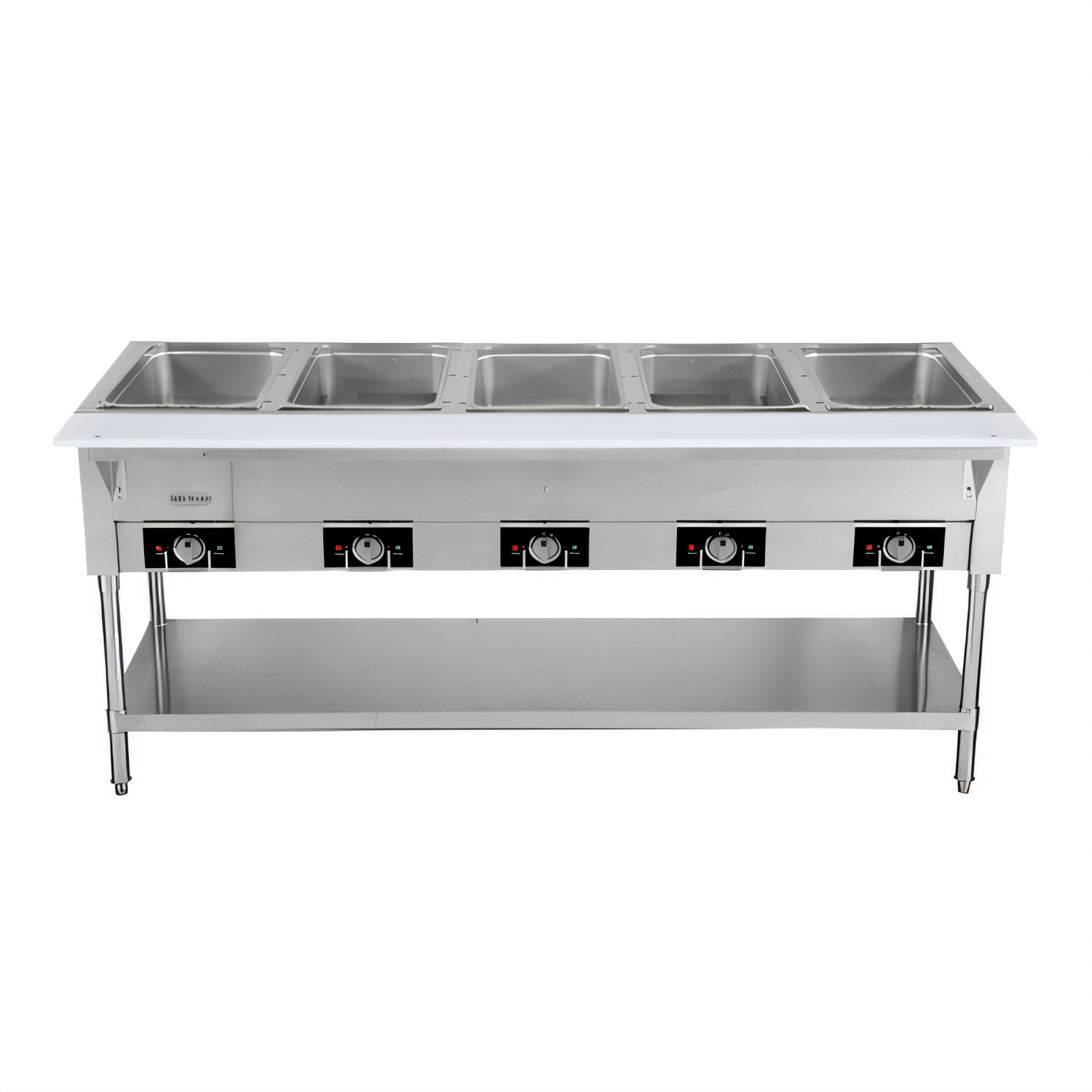 Hot Food Table, electric, 72-3/10"W x 29-1/2"D x 33-1/2"H, (5) open wells (accommodates standard size pans), individual infinite controls, stainless steel heating elements, removable cutting board, stainless steel open base with undershelf, adjustable stainless steel feet, 3750 watts, 220-240v, ETL-Sanitation