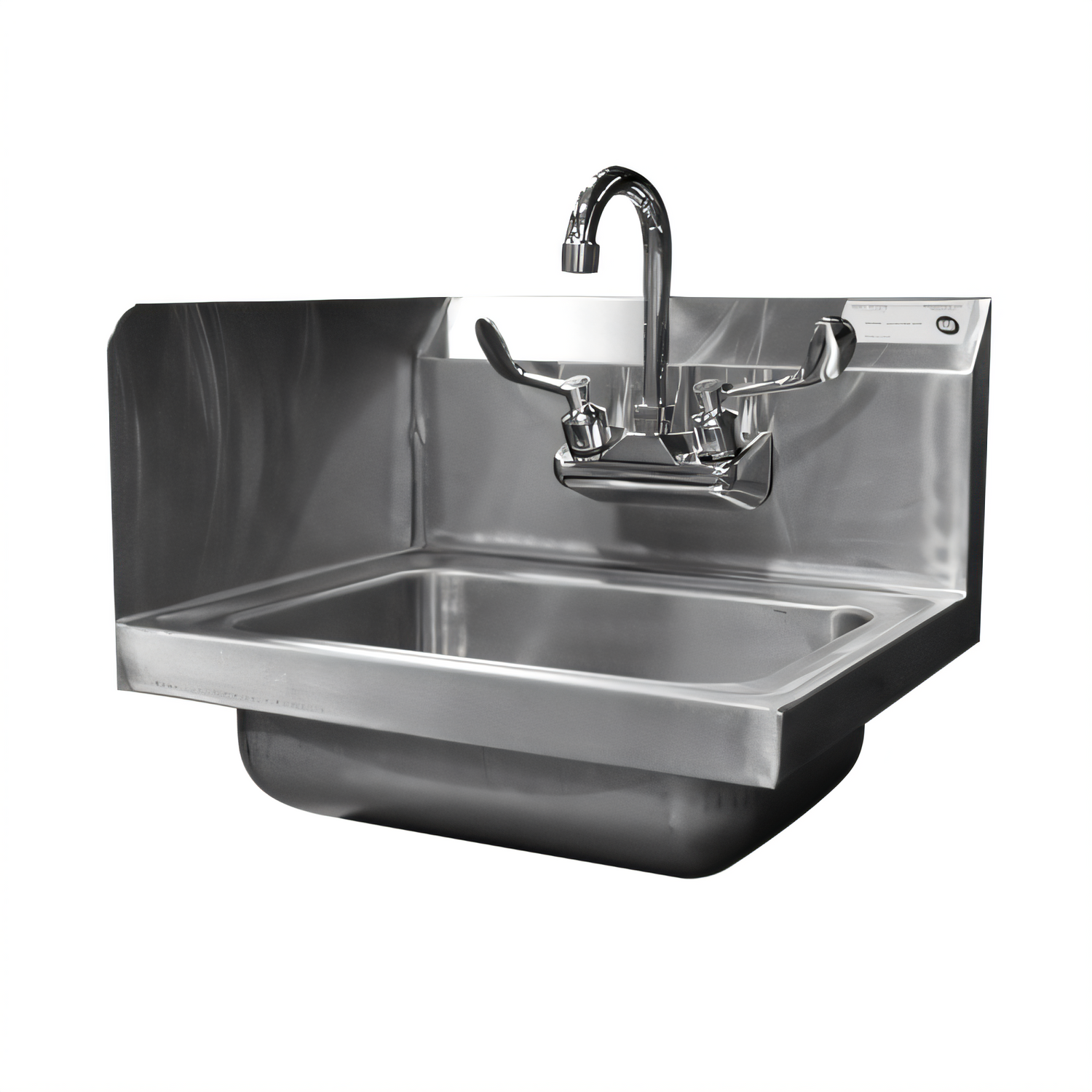 Serv-Ware - Sinks - S/S Hand Sink with Splash Guard Left - 17" W x 15" D x 13.5" H - Materials: 18 Gauge, 304 Series Stainless Steel Top - Bowl 14" W x 10" D x 5.5" H, 7.75" backsplash, includes 4" gooseneck faucet with wrist blade handles, 1.15" basket strainer, mounting bracket included, 18/304 stainless steel construction, NSF