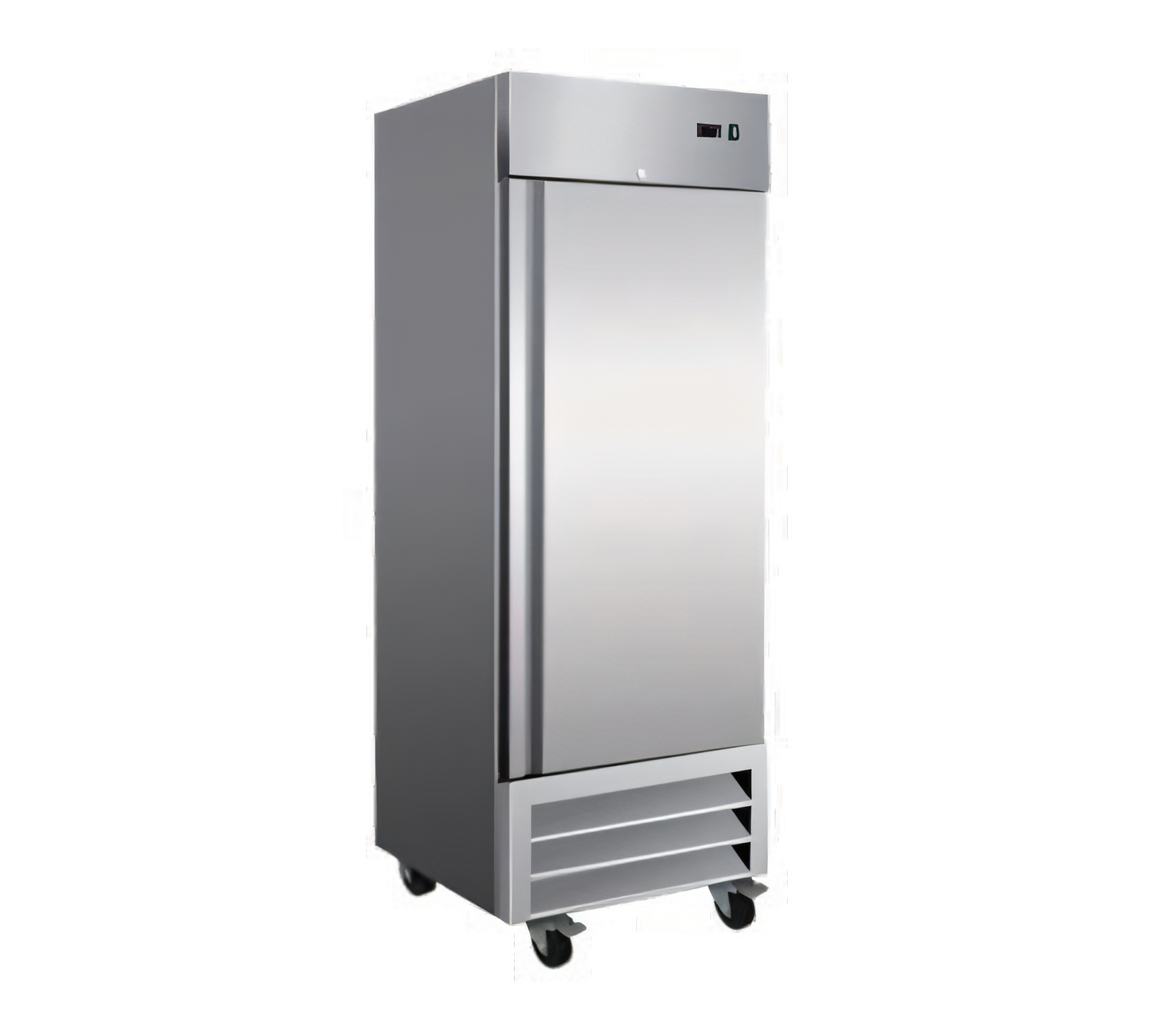 Reach-In Freezer, one-section, 26.8"W x 25.6"D x 82.3"H, 19 cu. ft. capacity, (1) hinged self-closing & lockable solid door, full length handle, (3) adjustable epoxy coated shelves, auto defrost, electronic thermostat, LED digital display, painted aluminum interior with 304 stainless steel floor, 430 stainless steel door & front panel, (4) casters (2 braked), bottom mounted self-contained refrigeration, UL-Energy Verified, CE, UL EPH Classified, cULus
