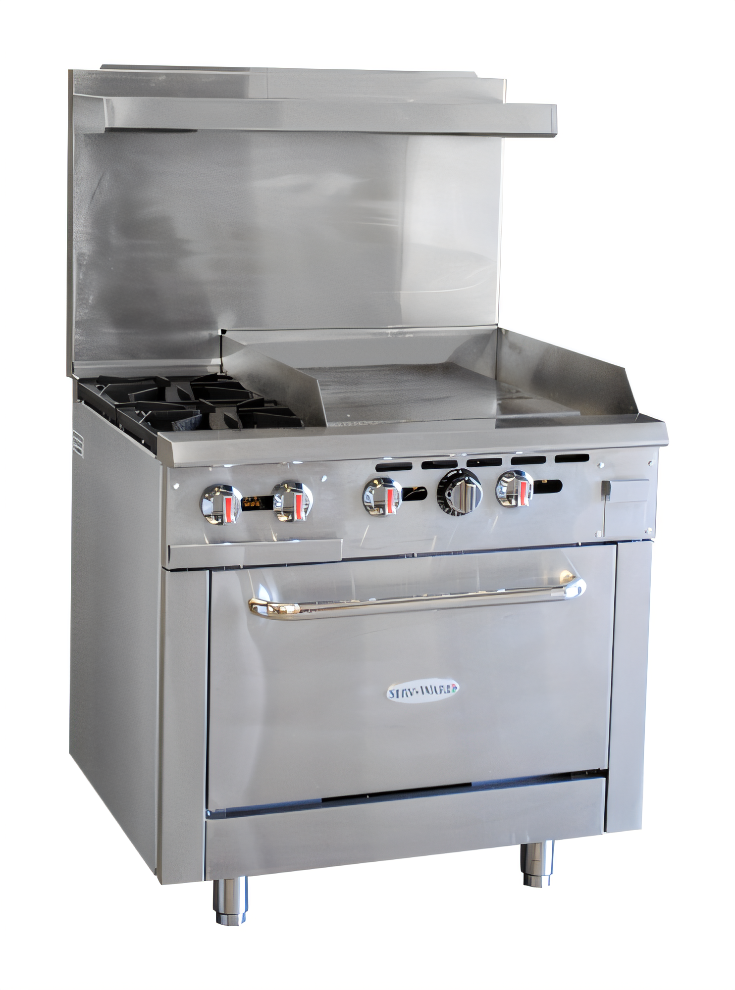 Restaurant Range, natural gas, 36", (2) 30,000 BTU open top burners, removable heavy duty cast grates, 24" griddle, stainless steel pilot, (1) 31,000 BTU oven with U-shaped burner, includes (2) racks per oven, back riser with shelf, pull out crumb tray, stainless steel front & back riser, galvanized sides, 6" adjustable legs, cETLus, ETL-Sanitation (ships with LP conversion kit)