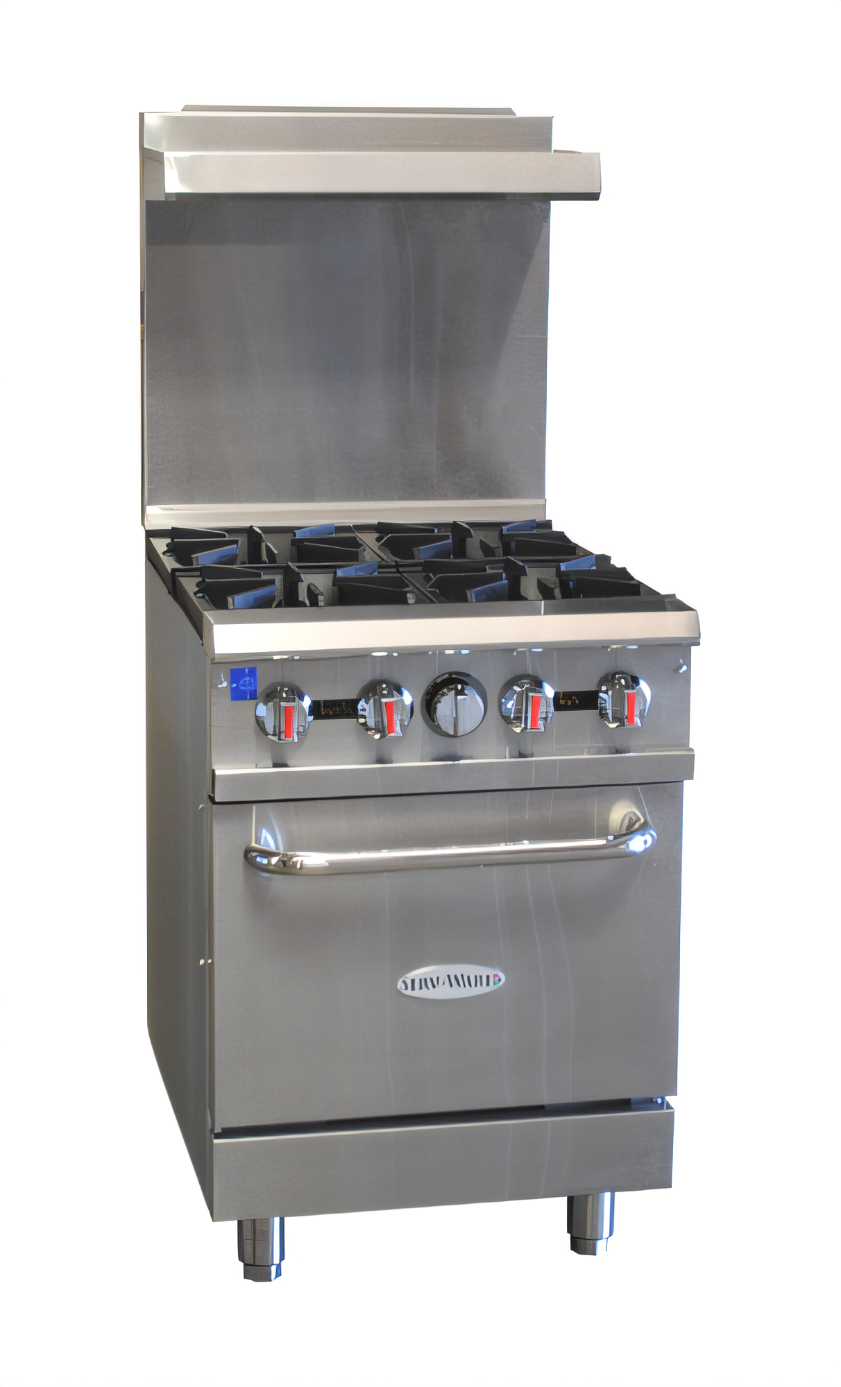 Restaurant Range, natural gas, 24", (4) 30,000 BTU open top burners, removable heavy duty cast grates, stainless steel pilot, (1) 31,000 BTU oven with U-shaped burner, includes (2) racks per oven, back riser with shelf, pull out crumb tray, stainless steel front & back riser, galvanized sides, 6" adjustable legs, cETLus, ETL-Sanitation (ships with LP conversion kit)