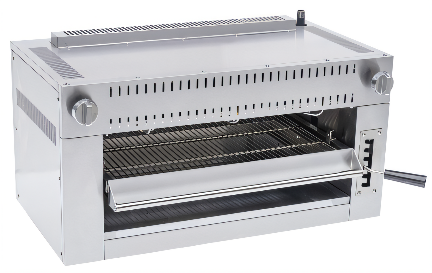 Salamander Broiler, gas, 36" wide, (6) infrared type burners, manual controls with pilot, roll out grid rack assembly, (5) height locking positions, stainless steel crumb tray, wall mounting kit included, ³⁄4" NPT rear gas connection, 48,000 BTU, cETLus, ETL-Sanitation