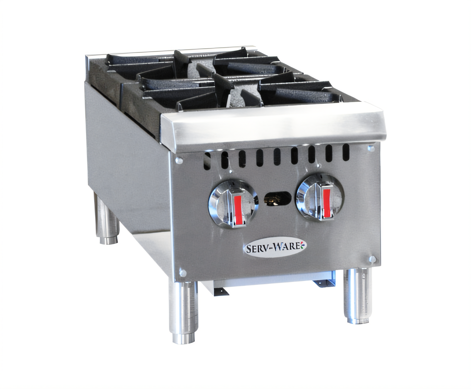 Hotplate, gas, countertop, 12"W, (2) octagonal cast iron burners, cast iron grates, standby pilot, manual controls, bottom crumb tray, stainless steel front & sides, adjustable stainless steel legs, 50,000 BTU, cETLus, ETL-Sanitation (configured for natural gas, LP conversion kit included)