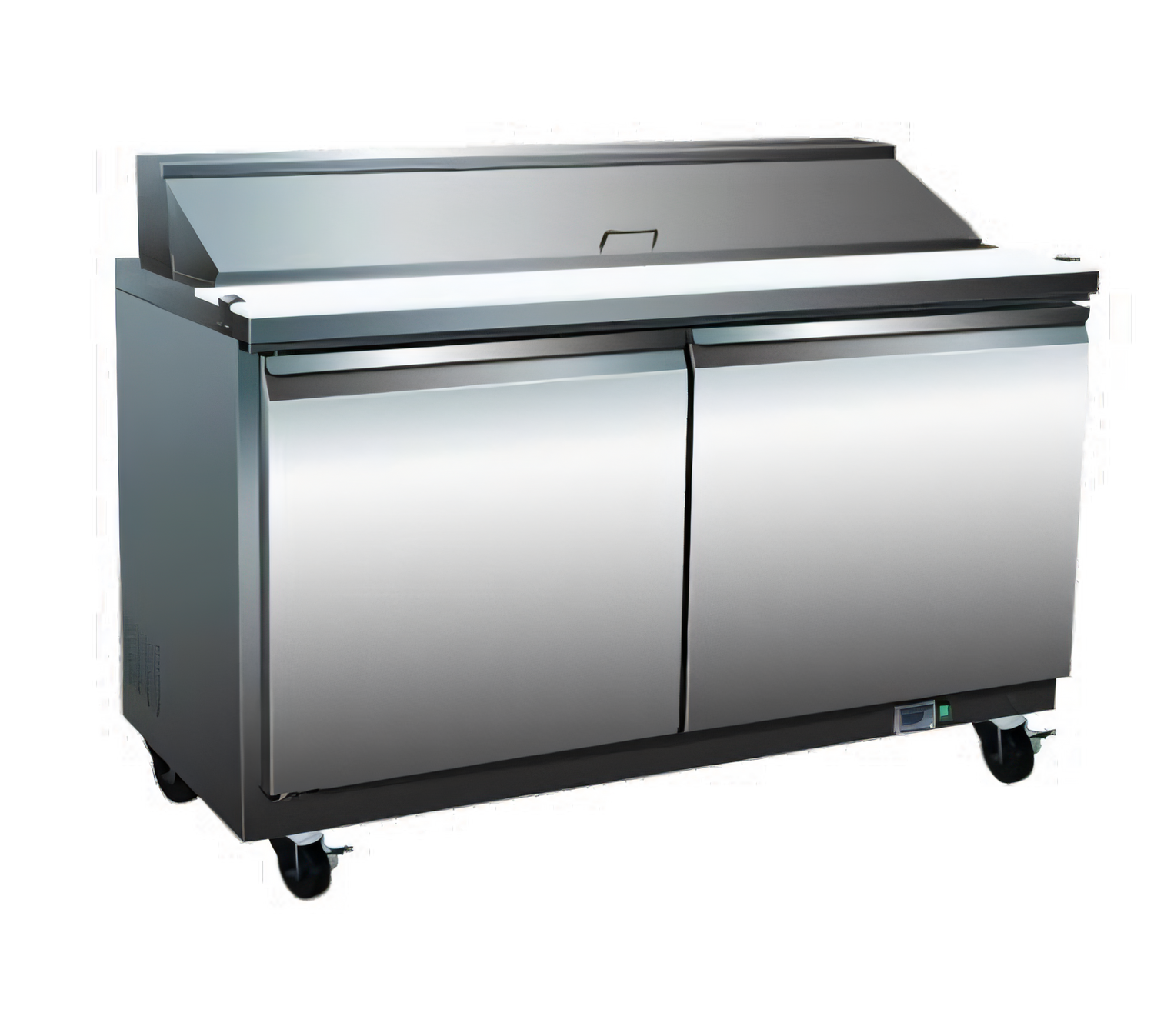 Mega Sandwich/Salad Prep Table, two-section, 48-1/5"W x 34-1/2"D x 43-1/5"H, (12) cu. ft. capacity, (2) self-closing solid doors, full length handles, (2) adjustable epoxy coated wire shelves, includes: (18) 1/6 plastic pans & cutting board, electronic thermostat, LED digital display, auto defrosting & evaporation, stainless steel front & sides, aluminum back, ABS interior with stainless steel floor, rear mounted self-contained refrigeration, R290 Hydrocarbon refrigerant, (4) casters (2 braked), CE, cULus Classified, UL EPH Classified