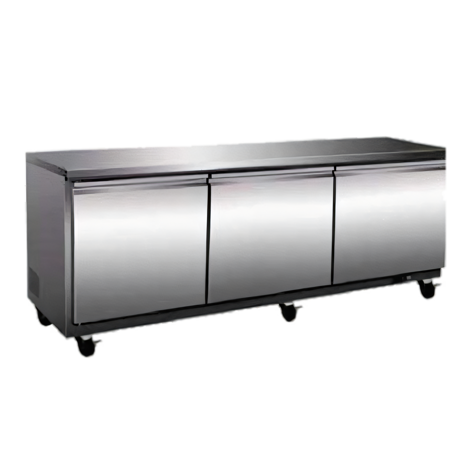 Freezer, undercounter, three-section, 71-1/2"W x 29-9/10"D x 35-1/2"H, 18 cu. ft. capacity, (3) self-closing solid doors, full length handles, (1) epoxy-coated wire shelf per door, electronic thermostat, LED digital display, auto defrosting & evaporation, stainless steel front & sides, ABS interior with stainless steel floor, (4) casters (2 braked), rear mounted self-contained refrigeration, cULus Classified, UL EPH Classified, CE