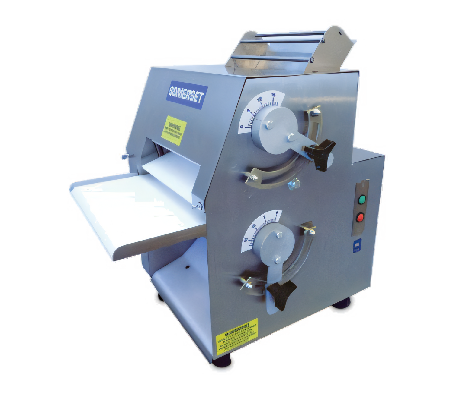 Somerset® Dough Roller, 11" synthetic rollers, sheets 500-600 pieces per hour up to 11" diameter, front operation, manual roller adjustable, safety sensors, removable spring loaded synthetic scrapers, large hopper, stainless steel construction, 1" legs with rubber boots, 1/4 HP, cETLus, NSF, CE, USDA